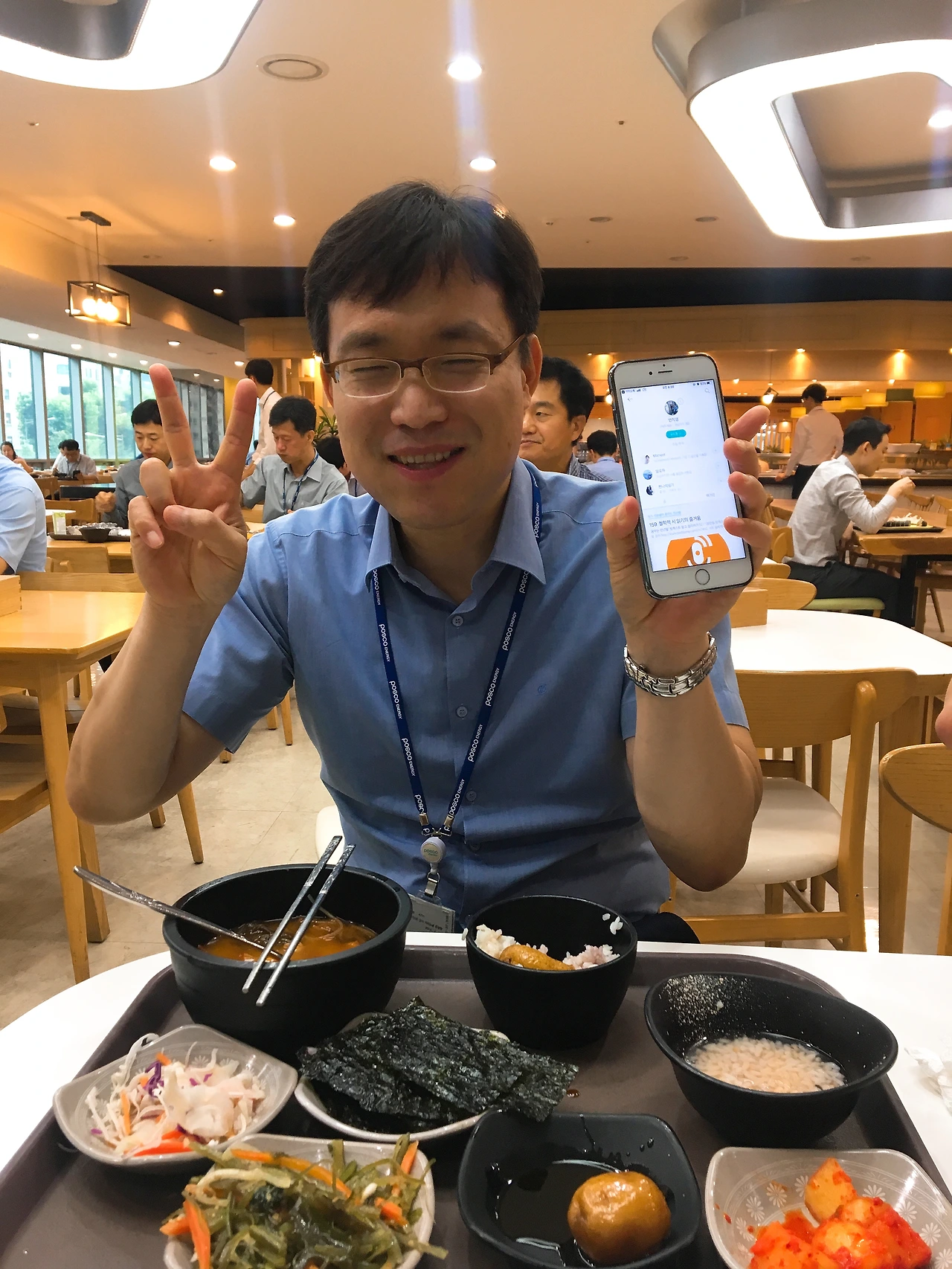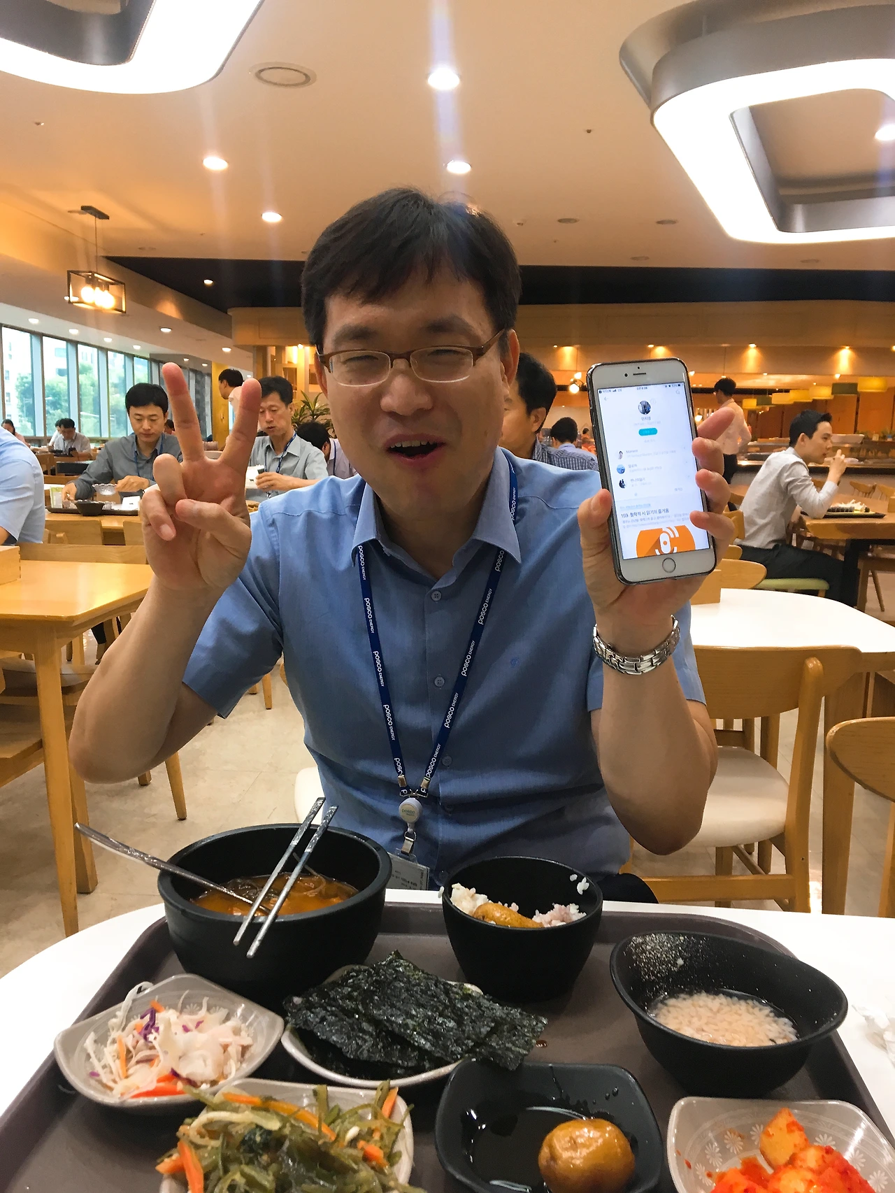 그룹장님께서는 식사를 하시다 말고 좋아요도 눌러주시고, 100번째 구독자가 되어주셨다. 감사하고 기쁜 마음이 들어 이 순간을 사진으로 남기기로 했다. 식사를 하던 중에 카메라를 들고 찰칵, 찰칵! 기분 좋은 아침이었다.