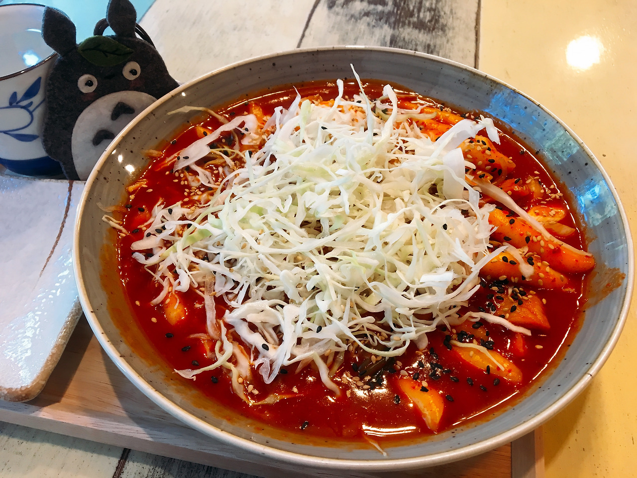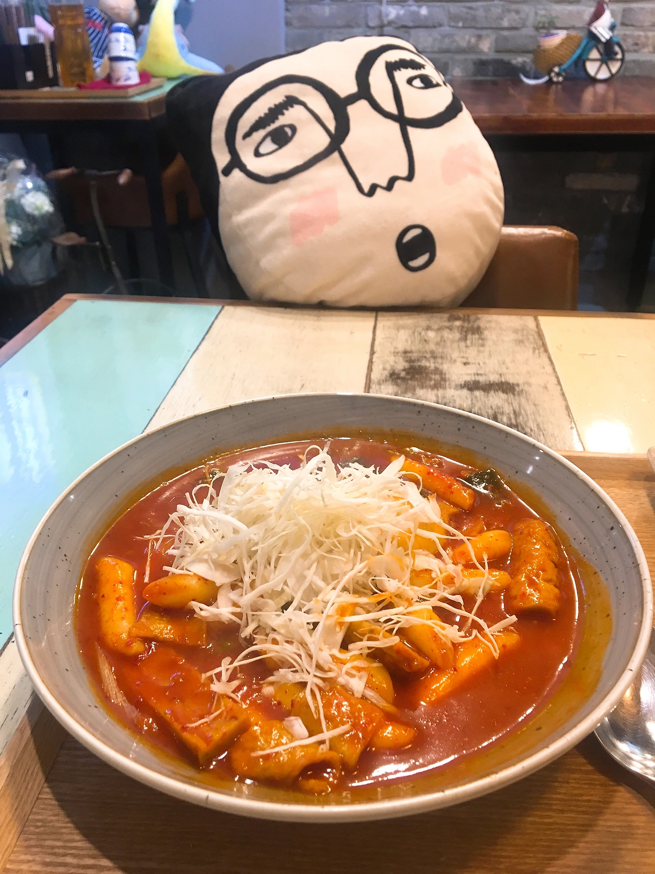 인천공항에 도착하면 가장 먼저 먹겠노라고 다짐했어요. 그리고 집 근처에 새로 생긴 카페에서 떡볶이를 판다는 것을 알게 되었습니다. 큰 캐리어와 짐을 한 보따리 들고 낑낑대며 들어갔습니다. 해외여행 다녀왔는데 떡볶이가 너무 먹고 싶었다고 하니까 사장님께서 환하게 웃으시며 접시 한가득 빨간 떡볶이를 만들어주셨습니다. 그 위에 얇게 썬 양배추를 쌓아올려주셔서 더욱 군침이 돌았어요! 매콤달콤한 양념에 버무린 쫀득쫀득한 떡을 한입 베어 무니 참 행복했습니다. 매울 때는 양배추를 아삭아삭 씹으며 매운맛을 달랬고요. 딱 보기에도 2인분 같았지만 2인분 같은 1인분으로 한 그릇 뚝딱 비워냈습니다.