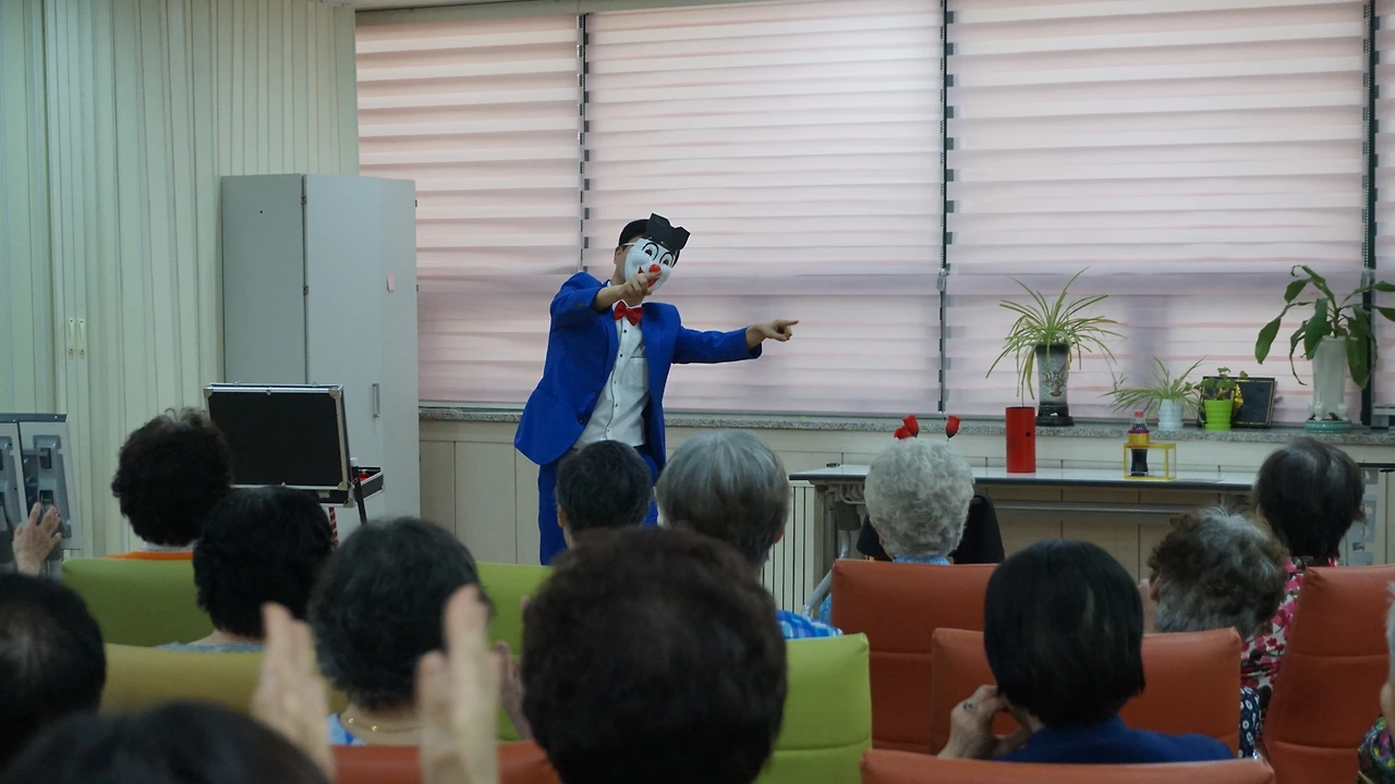자, 이제 마지막 순서인 마술팀 공연 시간입니다. 마술사가 우스꽝스럽게 생긴 가면을 쓰고 등장한 것만으로도 어르신들은 깔깔깔 웃으십니다. 재능봉사단 활동의 백미는 마술공연이라고 할 수 있을 정도로 베테랑 마술사이십니다. 의상부터 시작해서 표정, 몸동작, 목소리, 연기까지! 모든 것이 어우러져 신기한 마술공연이 펼쳐지면 어른아이 할 것 없이 좋아하세요. 함께 공연을 하면서 같은 마술을 몇 번째 보아도 신기하고, 감쪽같이 속습니다. 공연 중간중간 여기저기서 박수와 환호성이 터져나왔어요! 마술사님들도 신이 나셨는지 할 수 있는 모든 마술을 총동원해서 보여주시는 듯 열연하셨습니다.