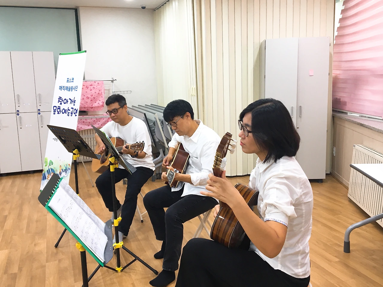 포스코매직예술봉사단은 기타, 앙상블, 마술팀으로 구성되어 있습니다. 세 팀이 완전체로 함께 하는 건 이번이 처음이예요. 지금까지는 앙상블팀과 마술팀만 함께 했거든요. 기타팀의 데뷔 무대가 있어 더욱 설레는 발걸음이었습니다.