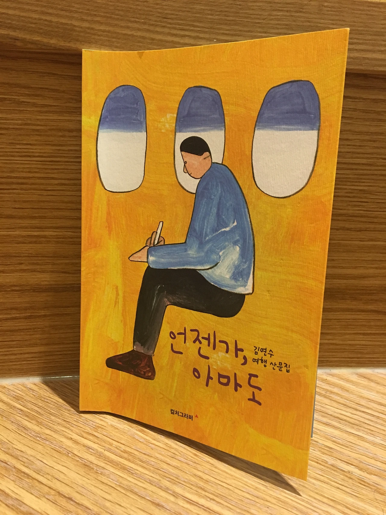 ‘김연수’라는 이름을 보기 전에 책표지가 예뻐서 먼저 손이 갔다. 비행기 안에 앉아 있는 남자. 그 뒤에 비행기 밖을 내다볼 수 있는 차창, 그리고 노란색 바탕. 아~ 예쁘다!
