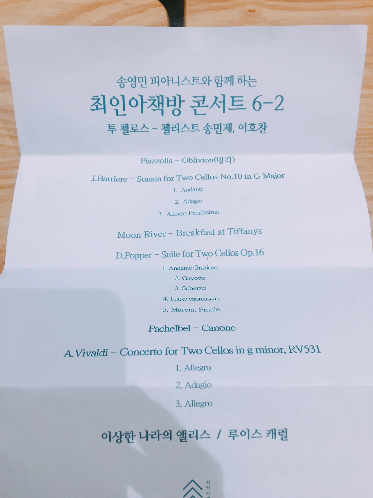 콘서트 곡 선정은 널리 알려진 곡 7, 익숙하지 않은 곡 3의 비율로 이루어진다고 한다. Moon River (티파니에서 아침을 ost)와 파헬벨의 캐논은 아주 유명한 곡이다. J.Barriere의 Sonata for two cellos No.10 in G Major와 D.Popper의 Suite for two cellos Op.16은 이번 콘서트를 통해 새로 알게 된 곡이다.