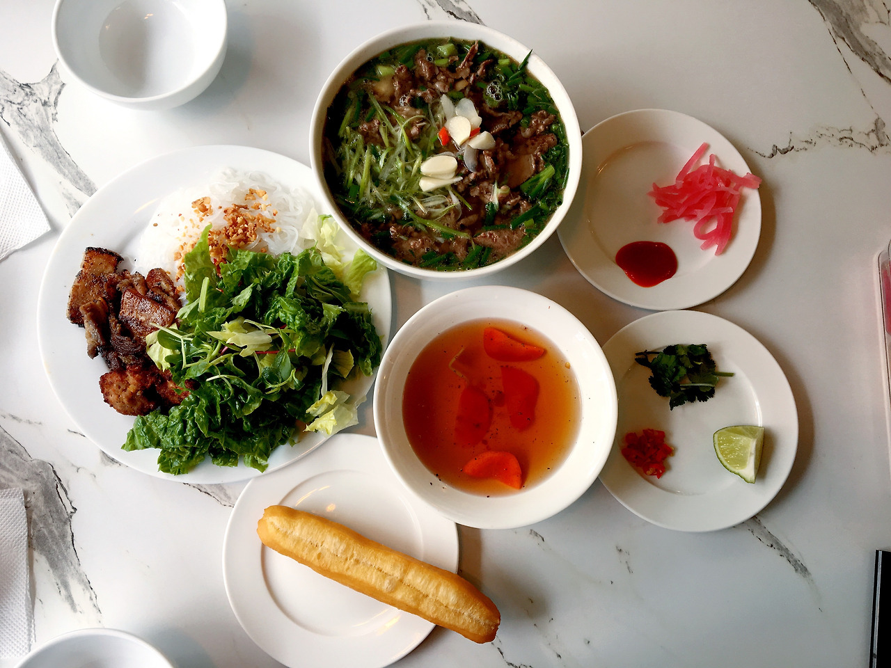 주문한 퍼틴 쌀국수와 분짜, 그리고 꿔이가 나왔다. 쌀국수 국물을 맛본 후 입맛에 맞게 특제 칠리소스와 마늘소스를 넣으면 되는데, 나는 마늘소스 넣는 것을 좋아한다. 고추도 조금 넣고, 상큼하게 라임즙도 짜면 먹을 준비 완료! 젓가락으로 국수를 집어 숟가락에 담고 눈으로 먼저 맛을 본 후 후루룩 한입 먹었다. 오래간만에 먹는 쌀국수라 먹고 있어도 먹고 싶은 마음이 들었다. 일명 저팔계 마음.(쌀국수 너무 맛있으셩~!) 따듯한 쌀국수 국물에 꿔이를 찍어 먹으면 별미다. 튀김우동을 먹는 것처럼 꿔이를 국물에 적셔 먹으면 참 맛있다.