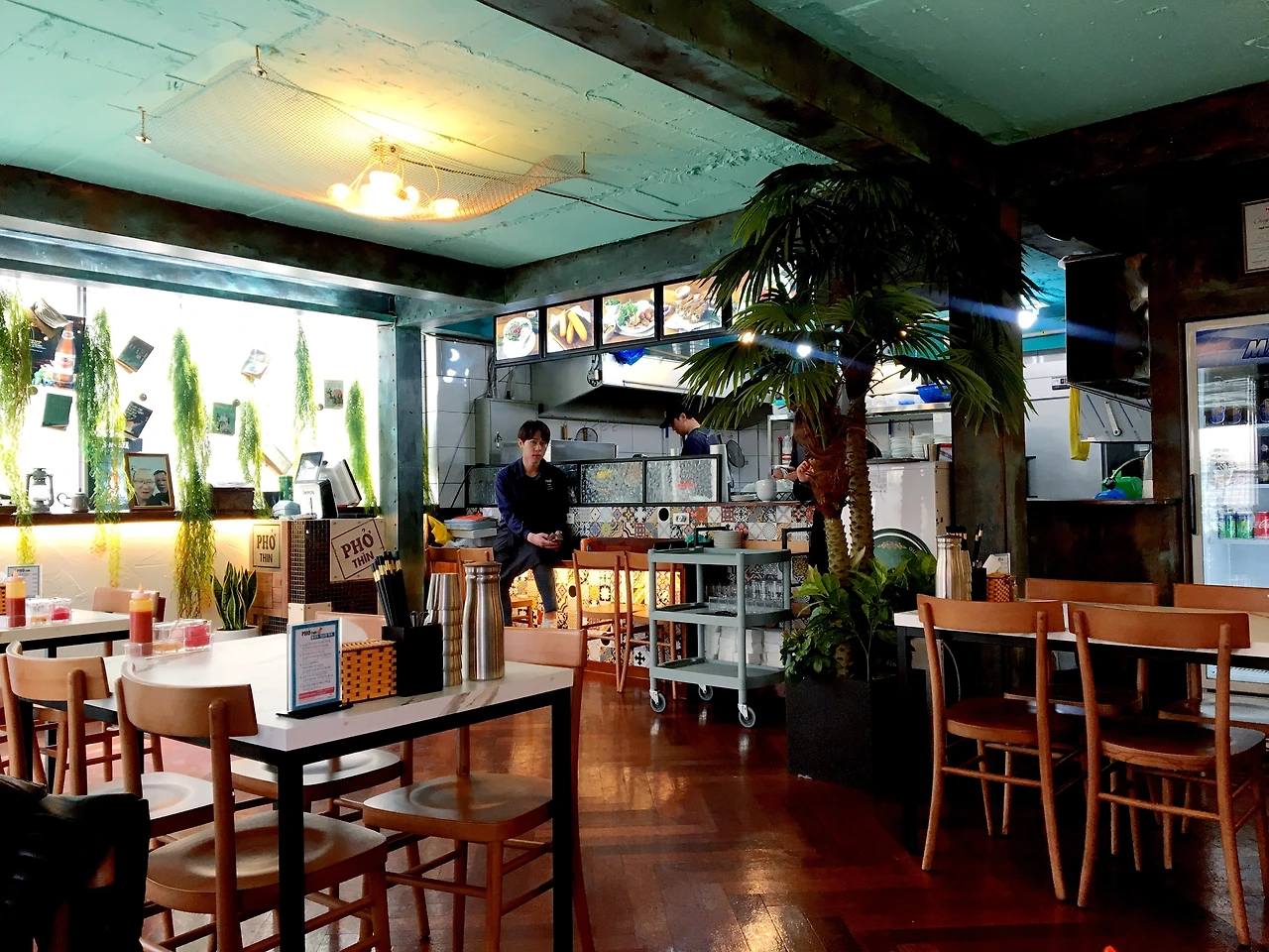 연남동 퍼틴은 최근 문을 연 베트남 쌀국수집이다. 문을 열고 들어갔을 때 나무 바닥과 민트색 천장, 식물로 꾸며진 벽이 눈에 들어왔다. 주방 쪽에는 야자수 모양의 화분도 놓여있다. 녹색 식물로 꾸며진 공간을 보니 마음이 편안해졌다. 점심시간을 약간 비껴갔더니 사람이 많지 않아 공간에 여유가 있었다. 진한 쌀국수 냄새를 맡으니 베트남에 온 것 같은 기분이 들며 출출해졌다.