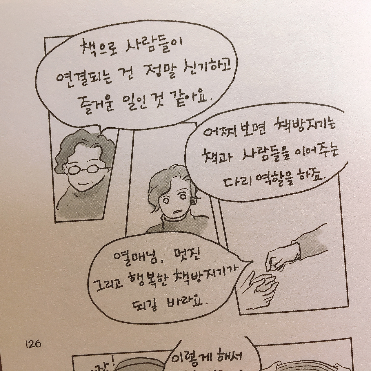 p126. 책으로 사람들이 연결되는 건 정말 신기하고 즐거운 일인 것 같아요. 어찌 보면 책방지기는 책과 사람들을 이어주는 다리 역할을 하죠.