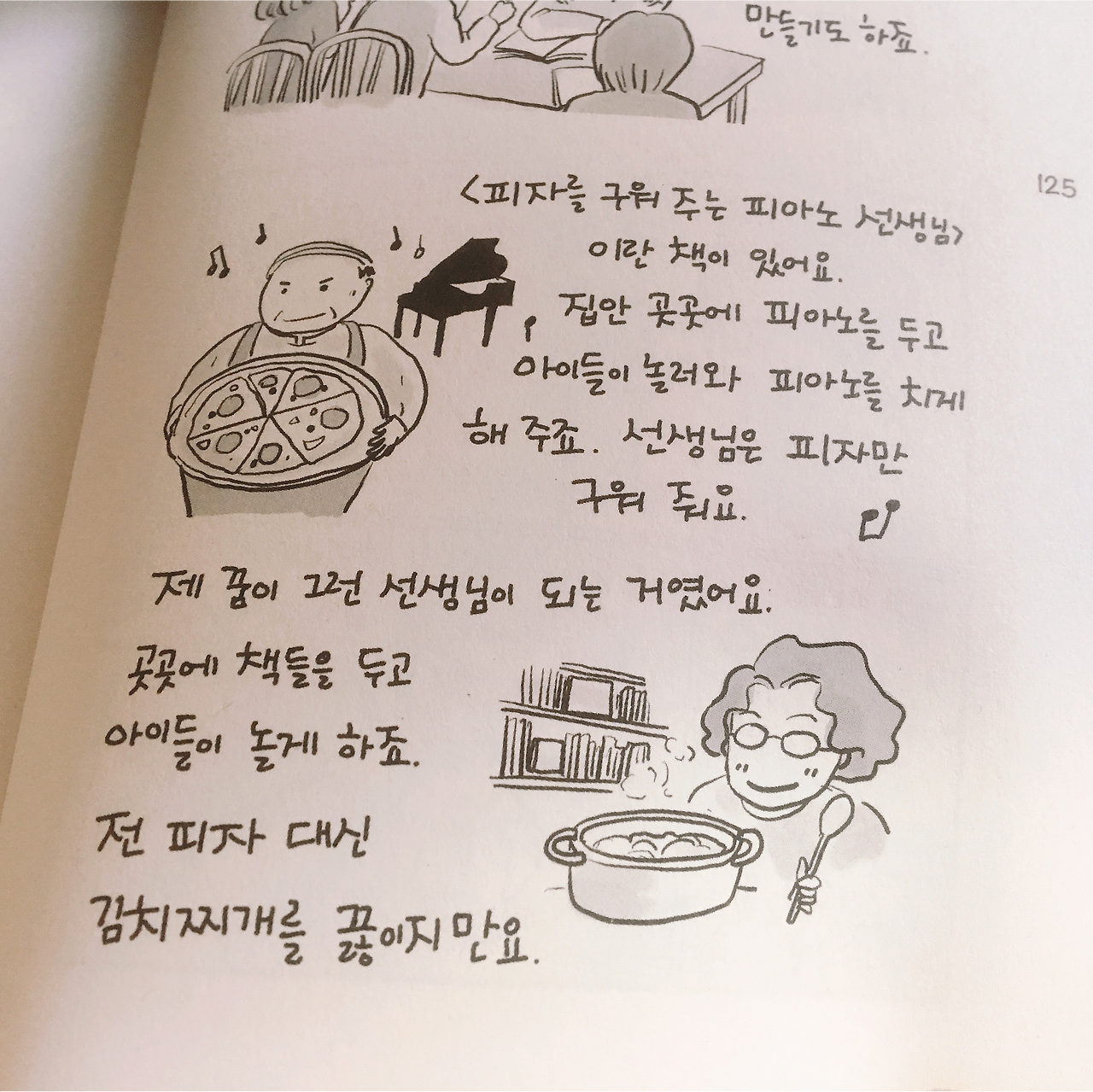 p125. <피자를 구워 주는 피아노 선생님>이란 책이 있어요. 집안 곳곳에 피아노를 두고 아이들이 놀러 와 피아노를 치게 해 주죠. 선생님은 피자만 구워 줘요. 제 꿈이 그런 선생님이 되는 거였어요. 곳곳에 책들을 두고 아이들이 놀게 하죠. 전 피자 대신 김치찌개를 끓이지만요.