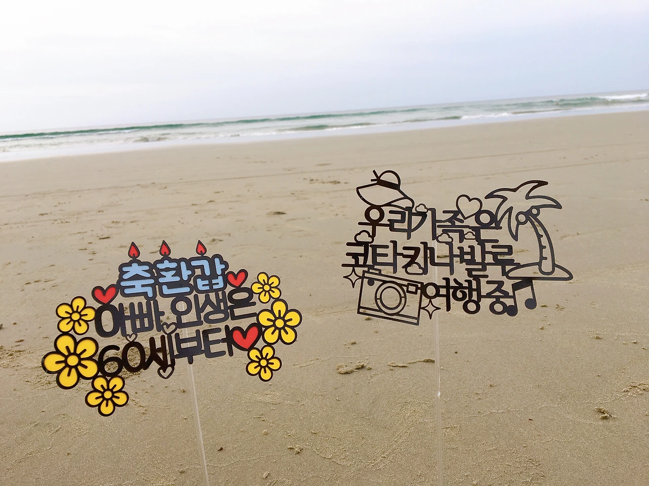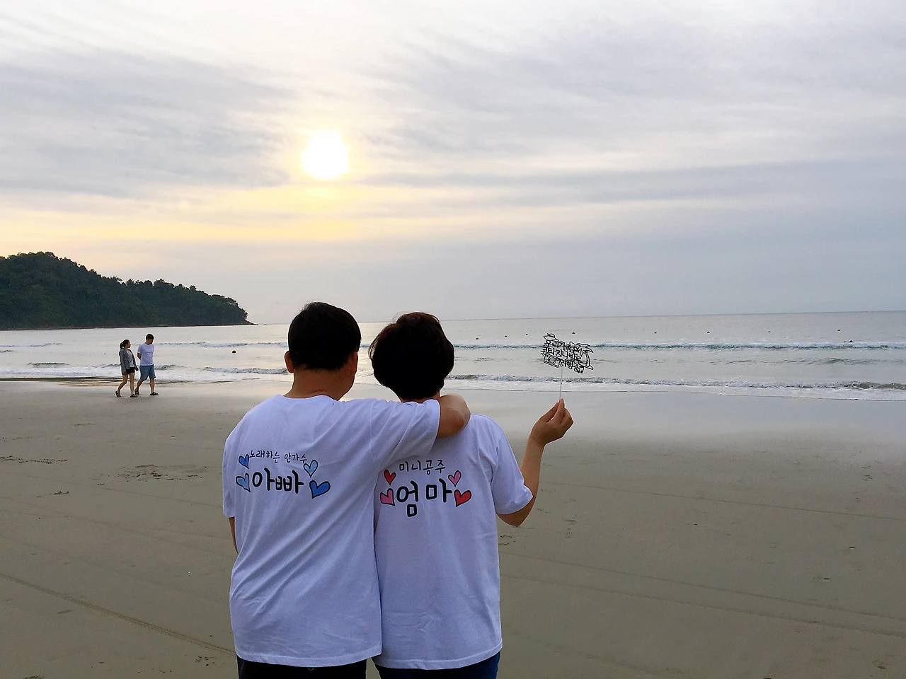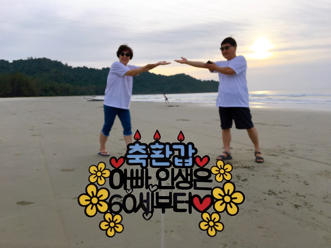 우리는 리조트 앞바다에서 해가 지기를 기다리며 사진을 잔뜩 찍었다. 놀랍게도 부모님께서 사진에 대한 의욕이 철철 넘치셨다. 마음에 드는 곳이 나타나면 이렇게 찍자며 구체적인 자세를 취하시기도 하셨다. ‘축 환갑 아빠 인생은 60세부터’, ‘우리 가족은 코타키나발루 여행 중’이라는 문구를 담은 토퍼도 엄마 아이디어였다. 그렇게 토퍼를 활용하기도 하고 점프하거나 뒷모습을 찍는 등 우리의 사진을 많이 남겼다.