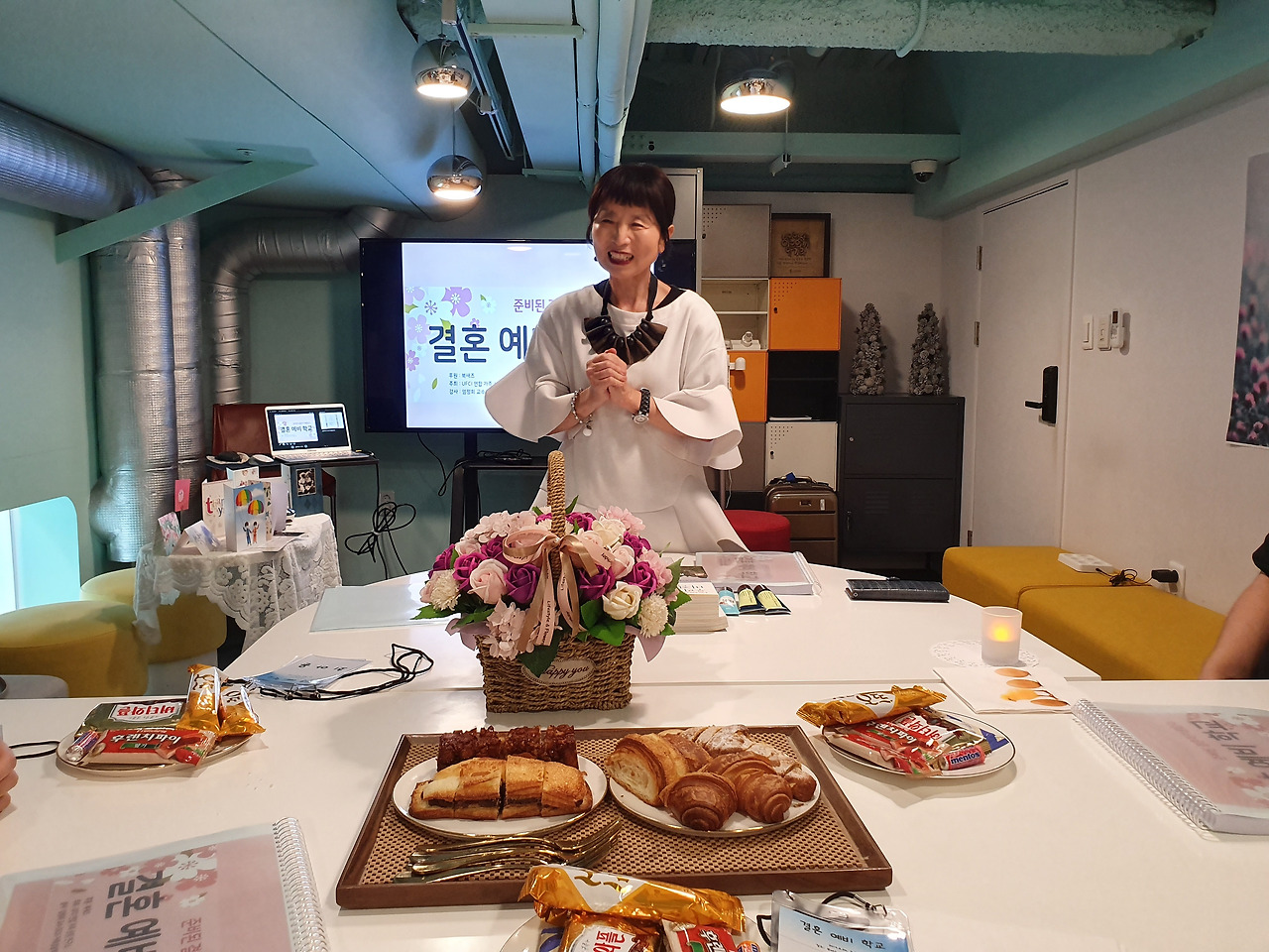 엄정희 교수님께서 환한 미소로 세 커플을 반겨주셨다. 꽃바구니와 초, 맛있는 빵과 음료까지 많은 것들을 준비해주셨다. 그중에서도 교수님의 환영이 가장 큰 선물이었다. 예비부부를 만날 생각에 설레었다는 마음을 가득 표현해주신 교수님께 감사했다.