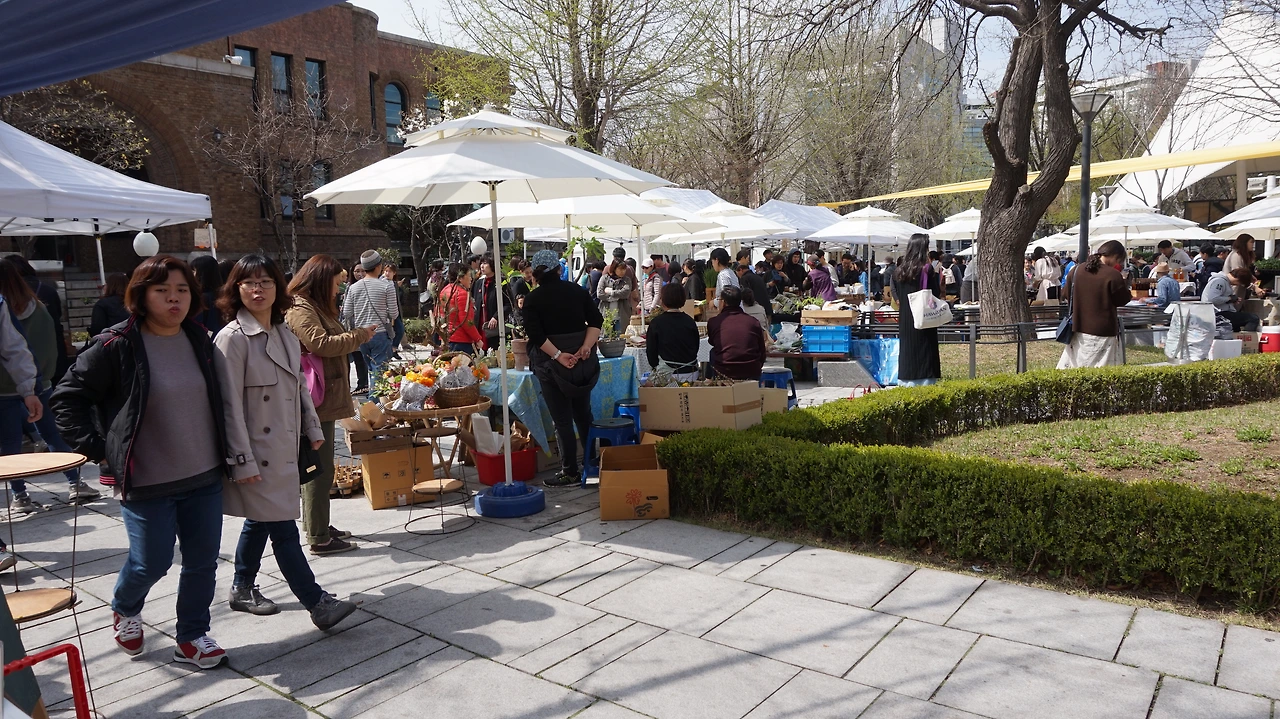 지난 4월 8일 혜화에서 열린 마르쉐@혜화를 찾아가보았습니다. 지하철 4호선 혜화역 2번 출구를 나서 마로니에공원 예술가의 집 일대에 도착하니 마르쉐를 상징하는 파란색과 노란색 천이 봄바람을 타고 춤을 추고 있습니다. 곧 있으면 축제와 같은 분위기의 장터가 열린다니 기대감으로 마음이 한껏 부풀어올랐습니다.