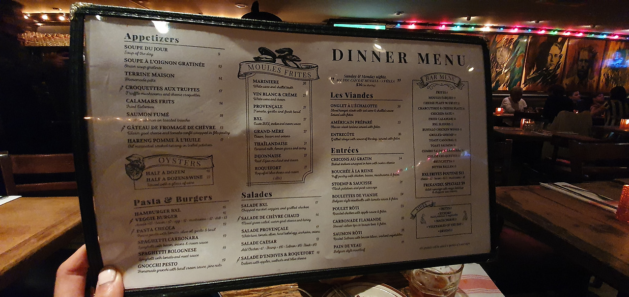 * [메뉴 참조] Sunday & Monday nights. "All you can eat mussels" + 1 stella - $27 (no sharing)