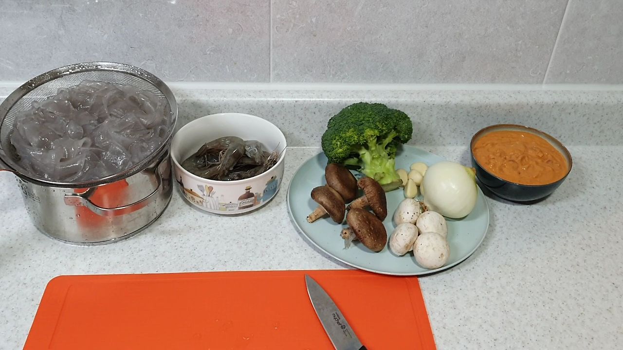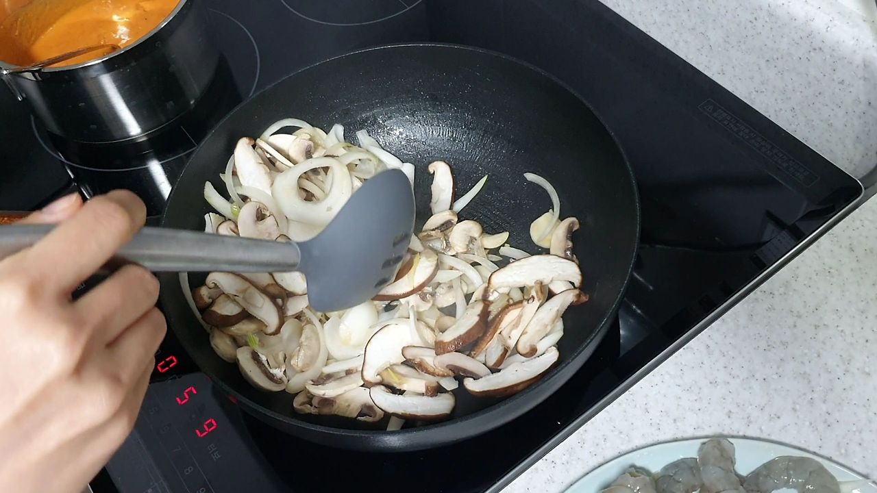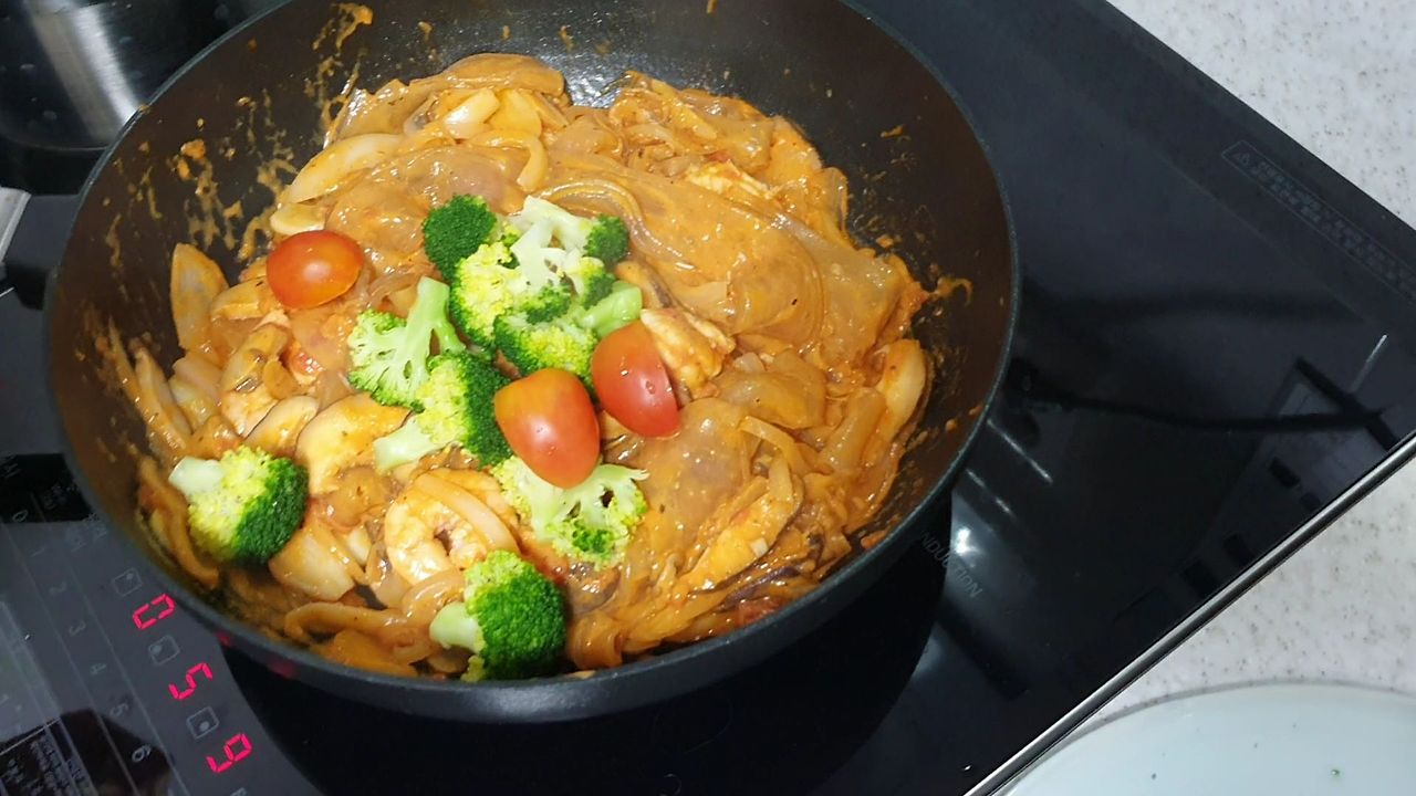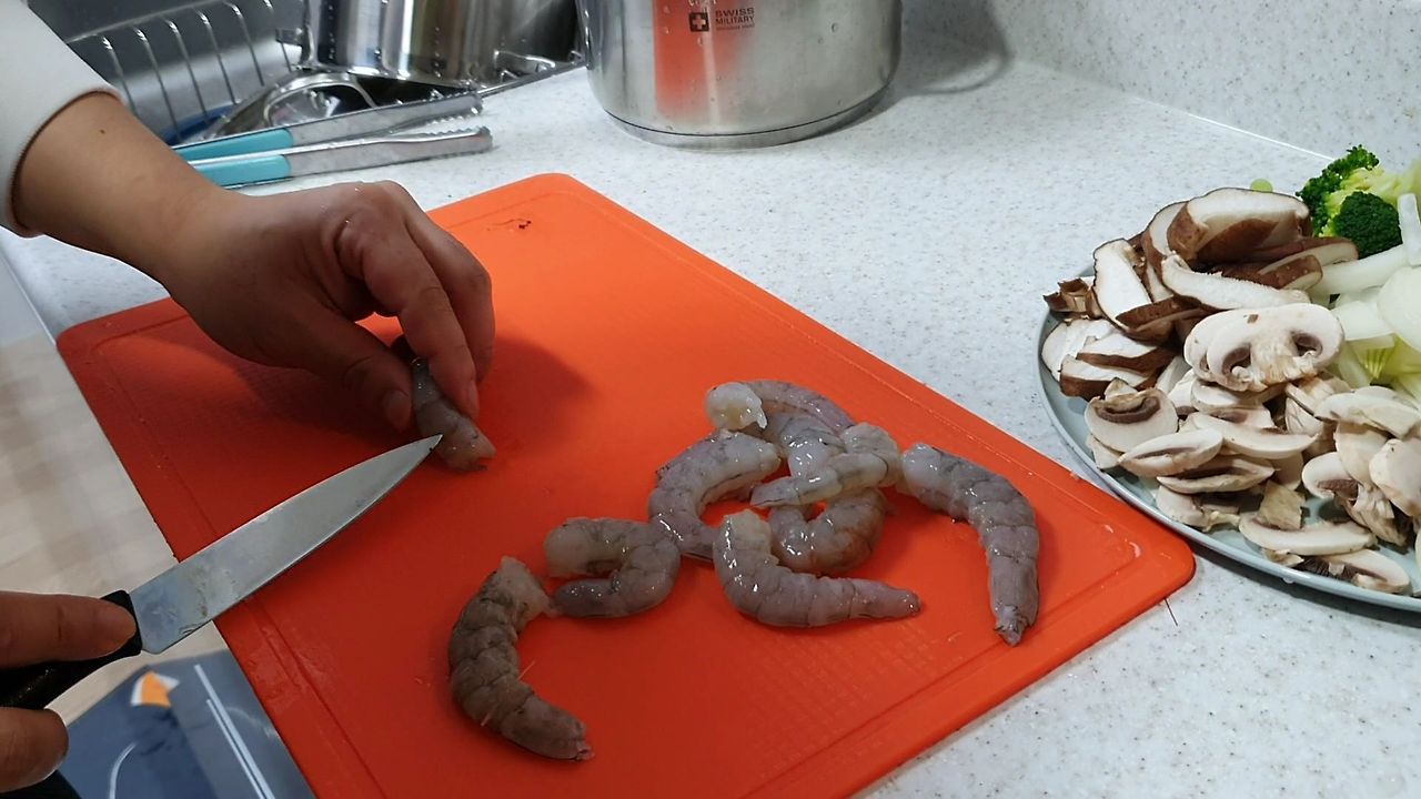 셰프인 남편이 시범을 보여주면 따라서 함께 요리했다. 브로콜리, 양파, 마늘, 버섯 썰기 뿐만 아니라 새우 껍질을 벗기고 새우 똥이라 불리는 내장 빼기까지 함께했다. 팔팔 끓는 물에 당면을 익히고 브로콜리를 데쳤다. 그리고 나머지 재료들은 마늘, 버섯, 양파 순으로 넣고 볶았다. 가장 먼저 마늘을 볶으니 마늘향이 퍼지면서 맛있는 음식이 탄생할 것 같은 예감이 들었다.
