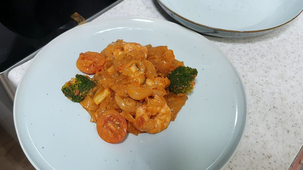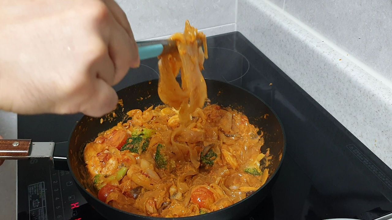 살짝 익힌 당면과 데친 브로콜리를 마지막 순서로 넣고 볶다가 보글보글 거품을 올리며 끓기 시작한 로제 소스를 그 위에 부었다. 조리 순서를 따라가는 중간중간 음식물 쓰레기를 정리하고, 큰 접시는 설거지하면서 완성해갔다. 제법 먹음직스러운 로제 파스타가 탄생했다.