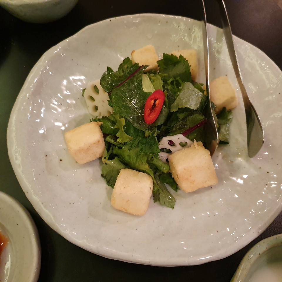 메뉴 중 '눈썹달 식탁' 코스를 선택했는데요. 처음으로 식탁에 올려진 음식은 레몬 생강장이 곁들여진 구운 두부와 채소입니다. 레몬 생강은 주로 따뜻한 차로 즐겨마셨는데 드레싱으로 들어가도 참 맛있더라고요~ 겉바속촉 구운 두부도 따뜻하고 맛있었습니다.