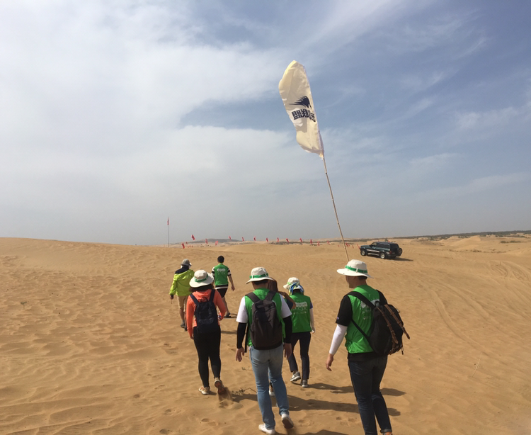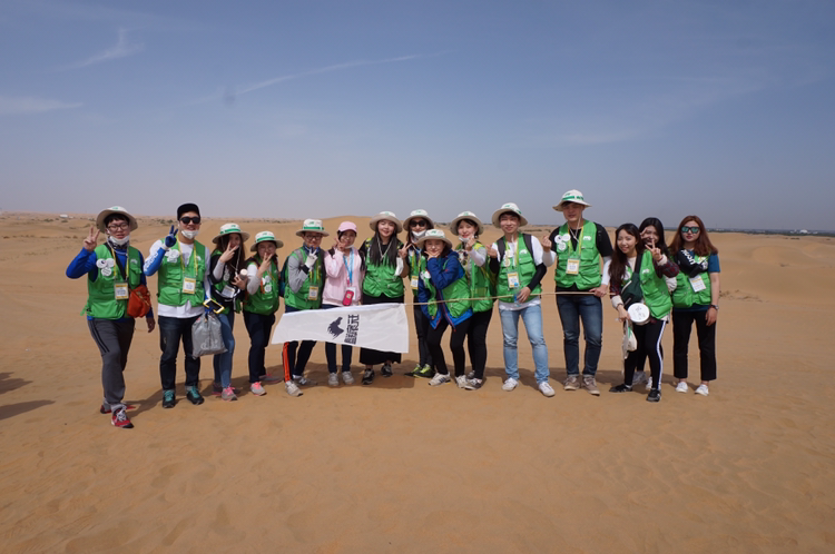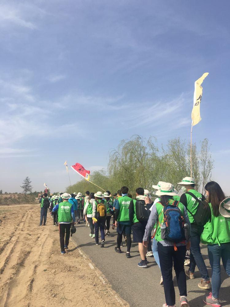사막에서 모래썰매를 탈까? 낙타체험를 할까? 보물찾기 한다는 소문도 있던데!! 모든 상상과 소문을 물리치고 트래킹을 했습니다. 걷는 것을 좋아하기도 하고, 바람이 선선하게 불어서 괜찮았어요. 우리가 나무를 심는 쿠부치 사막의 다른 부분인데 사구가 낮고 많지 않아 걷기 편했어요.