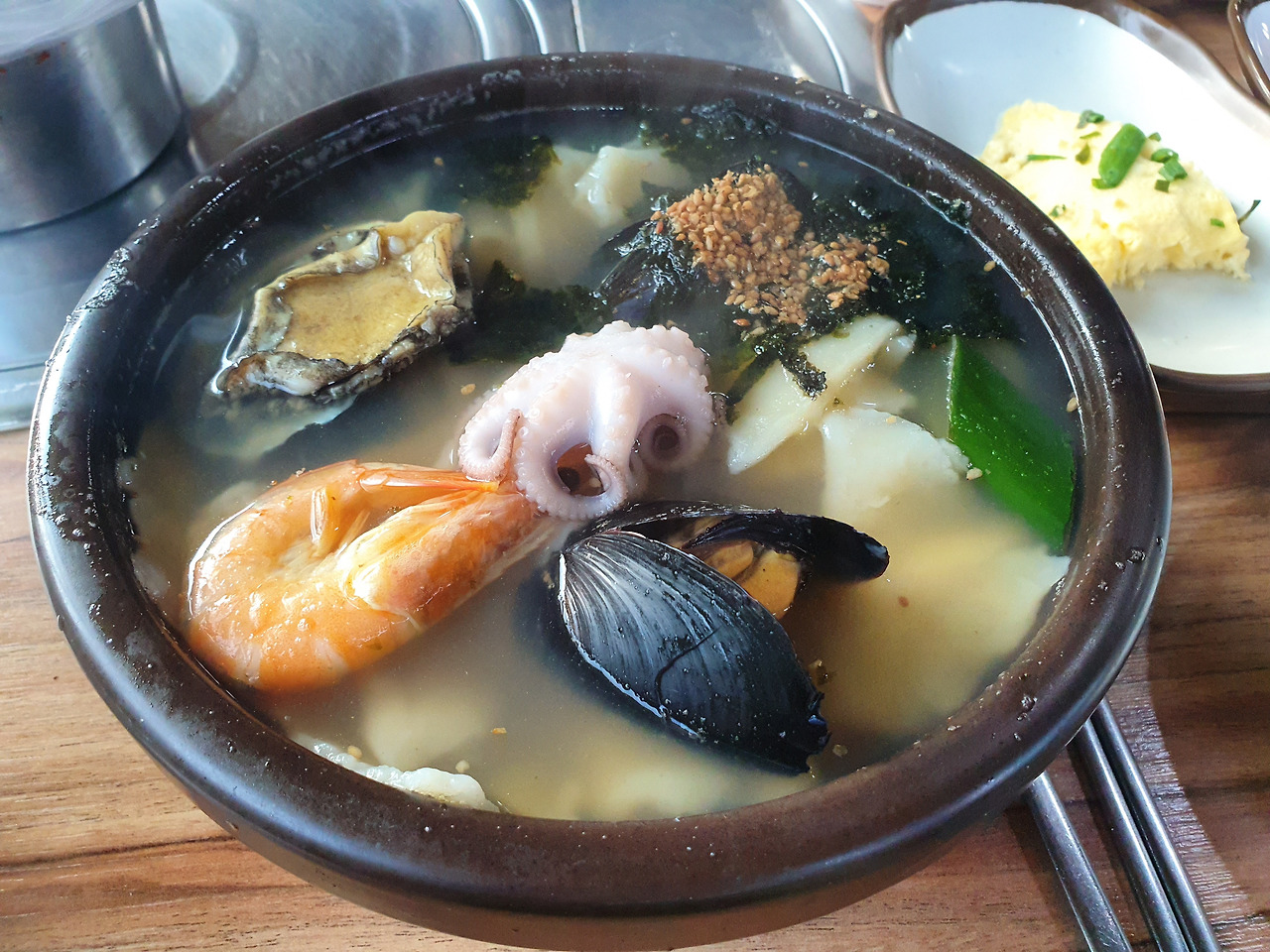저녁은 등명해변 근처 큰기와집에서 담백한 전복 수제비를 먹었어요. 주변에 횟집이 많았지만 임신부라 회를 먹기 어려워서 대안을 택한 거죠. 수제비도 정말 오랜만에 먹었는데, 그 안에 큰 전복과 새우, 홍합이 가득 들어가 국물 맛이 시원했습니다. 집에서 따라 해보고 싶은 요리였어요.