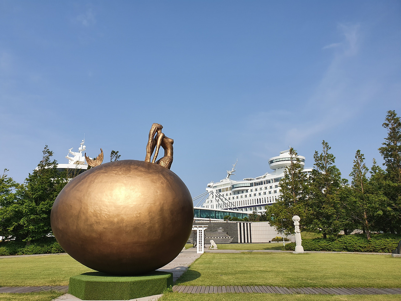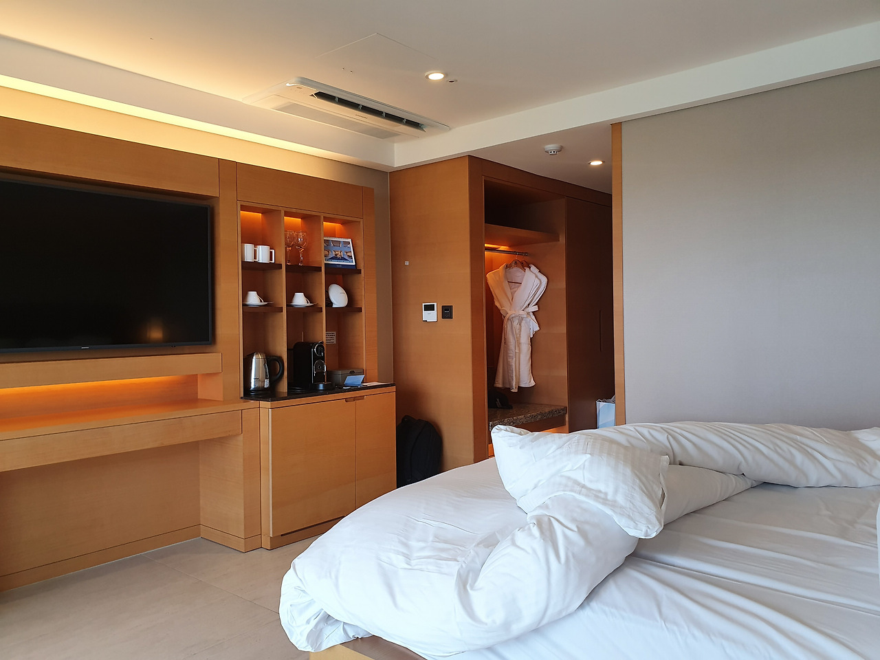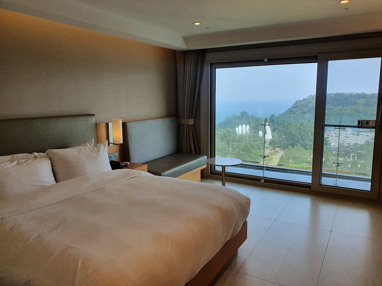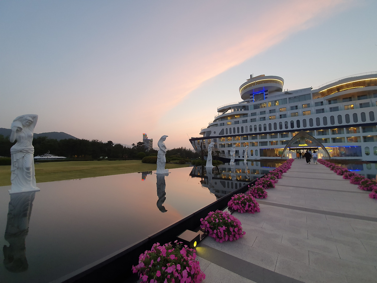 진입로부터 특이하고 인상 깊었어요. 아름다운 비너스상과 잉어가 가득한 연못을 지나 물 위에 배 모양 호텔로 들어갑니다. 로비에는 빵 냄새가 풍겨 베이커리를 그냥 지나칠 수 없게 만들어놨어요. 프런트 앞 풍경도 통유리로 시원하게 뚫려있어 바다를 구경할 수 있었습니다.