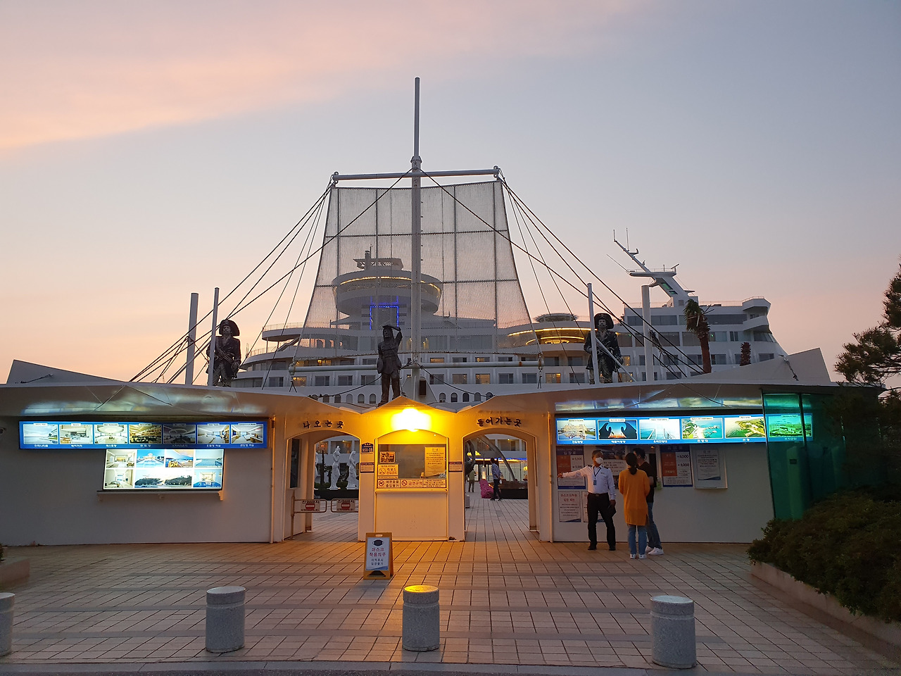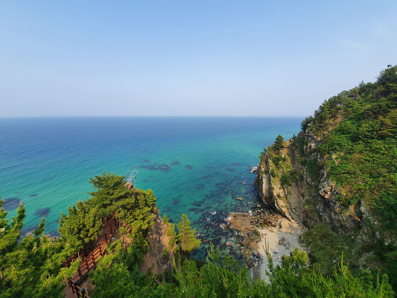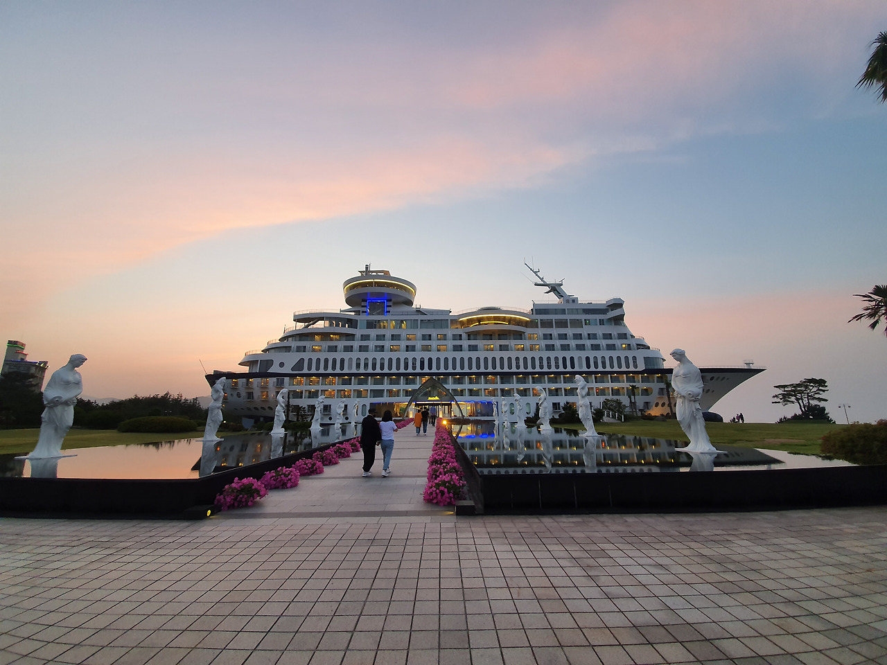 정동진 천혜의 해안절경 위에 위치하고 있어 조금 떨어진 곳에서도 배 모양 호텔이 잘 보여요. 호텔 내에서 푸르고 깊은 바다의 절경도 잘 보이고, 조각공원도 크게 있어서 산책하기에 좋습니다. 예전에는 조각공원에 기차 카페와 범선 카페도 있어 정동진 앞바다를 한눈에 내려다볼 슨 있었다고 해요. 지금은 그 흔적만 남아있는데, 위치를 활용한 테마 카페 아이디어도 좋았던 것 같아요.