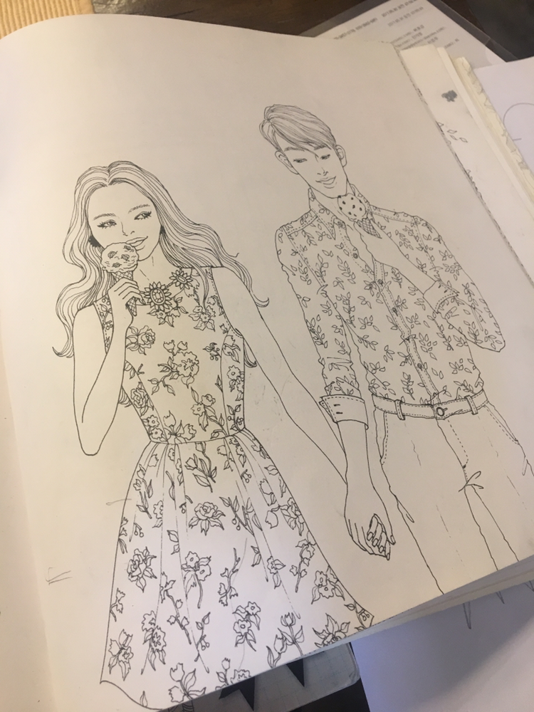 스케치를 시작할 때 카페 주인장인 작가님께서 컬러링북에 있는 그림을 참고할 수 있도록 3권의 컬러링북을 가져다 주셨어요. 잘할 자신이 없던 저는 가장 간단한 자연 패턴 그리기를 골랐는데요. 나뭇잎과 꽃을 하나씩 그리고보니 허전해보이고, 좀더 마음을 담을 수 있는 그림을 그려보고 싶었어요. 마침 선생님께서 도와주시겠다고 해서 아이스크림을 먹는 젊은 남녀의 모습을 그려보기로 방향을 바꿨습니다.