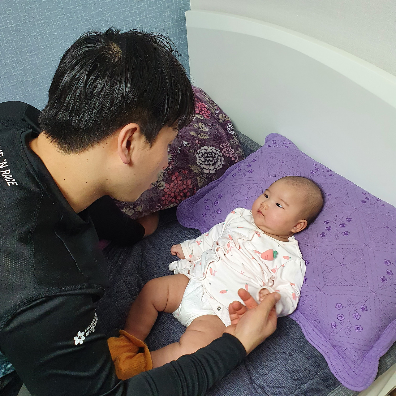 6일 만에 아빠가 대전에 왔어. 오랜만에 아빠 얼굴을 봤을 때 울길래 낯가림하는 줄 알았는데 익숙한 목소리에 금세 안정을 찾고 잘 놀더구나. 배속에서부터 듣던 목소리지?
