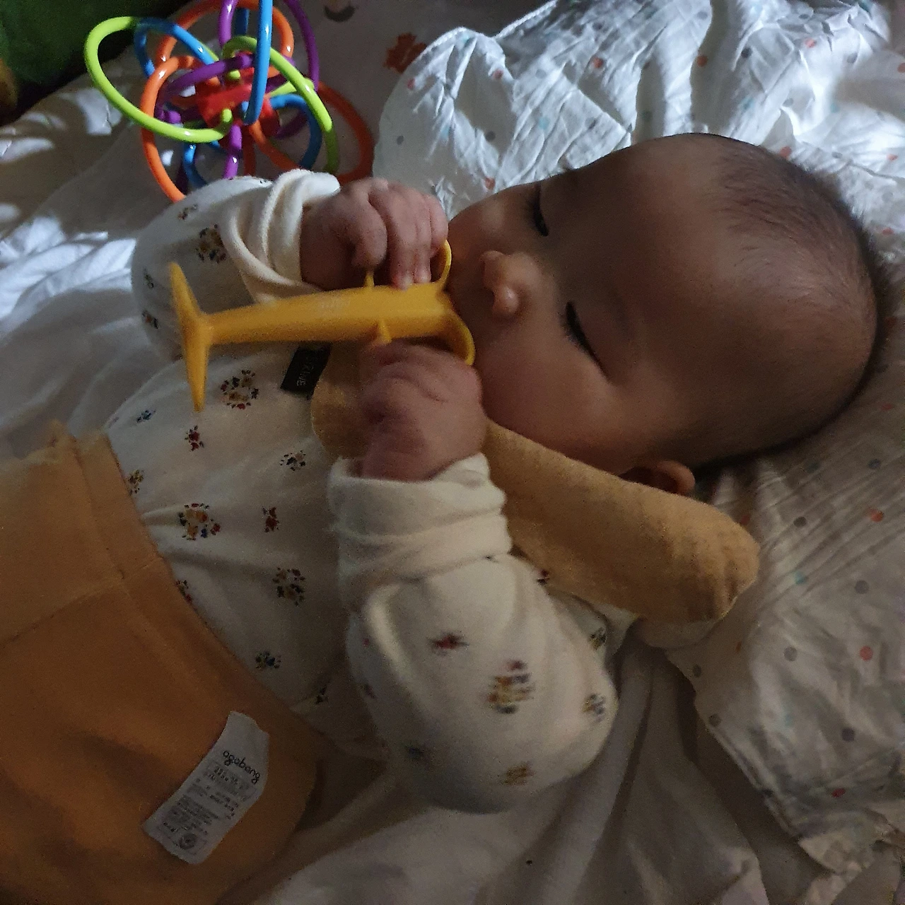 이가 빨리 난 빵이. 밤잠 자기 전에 많이 우는 원인이 혹시 이앓이가 아닐까 싶어 바나나 치발기를 쥐어줘 보았다. 처음 이가 난 걸 발견하고 치발기를 줬을 때는 관심이 없었는데 이제는 앙앙앙 물며 잘 갖고 논다. 이가 날 때 잇몸이 얼마나 간지러울꼬~ 치발기 덕분인지 모르겠지만 그나마 덜 울고, 수월하게 잠들었다. 자라느라 고생이 많아요, 우리 빵이~ 좋은 꿈 꾸기를.