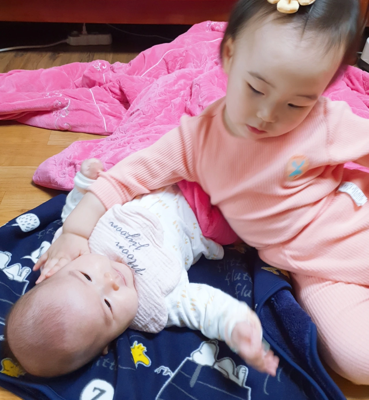 기다리던 조아 언니와의 첫 만남. 조아 언니는 빵이 사진과 영상이 나오는 스마트폰을 꼭 껴안을 만큼 동생을 좋아했대. 에너지 넘치는 세 살 조아 언니가 빵이를 예뻐하는 마음에 머리도 찔러보고, 볼도 찔러보고... 빵이도 조아 언니 좋다고 머리카락 꼭 잡고 안 놓고... 엄마는 계속 심장이 쫄깃쫄깃했단다. 조아 언니와 이틀을 보내면서 아이를 둘 낳아 키우면 이런 풍경이겠구나, 생각도 해보고 또 지금이 참 편한 시기라는 것도 많이 느꼈어. 신생아 시절 잠도 못 자고 힘들어할 때 지금이 제일 편한 시기라고, 갈수록 더 챙길게 많아질 거라는 말 많이 들었거든. 아직 빵이는 눕거나 안겨있고, 말을 못 하는데 조아 언니는 말도 잘하고, 뛰어다니고, 밥도 먹고 해야 하니까 정말이지 손이 더 많이 가더라고~ 아, 나는 힘든 게 아니었구나. 지금은 아주 편한 시기이구나,라고 마음속에서 깨달음의 별빛이 반짝반짝했어. 그래도 조아 언니처럼 빵이가 뛰어다니고, 밥을 먹고, 말을 할 때 어떤 모습일지 기대가 되고 기다려진다. 엄마가 보기에 빵이도 에너지가 만만치 않을 것 같아. 엄마 대학 때 별명이 지사인볼트였거든. 우리 슈퍼베이비 빵이도 지사인볼트 일듯? 엄마가 체력 단련하면서 기다리고 있을게. 오늘 낯도 안 가리고 의젓하게 가족들과 함께해줘서 정말 정말 고마워!