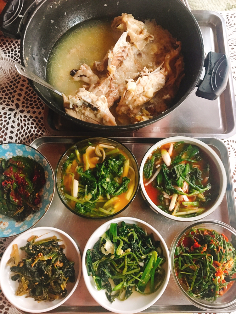 점심에 할머니댁에 방문하니 한 솥단지 가득 백숙이 준비되어 있었습니다. 옥상에 심은 상추와 부추, 고구마 순으로 반찬을 만드셨다고 해요. 상추로 김치를 담그셨는데 그 안에 수박 껍데기가 들어있었어요.