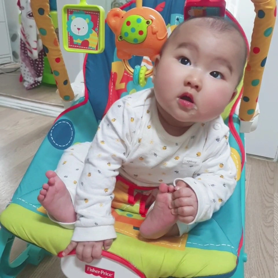 이제 바운서에 앉히면 앞으로 쑥 튀어나온다. 설거지하다가 그 모습을 발견하고는 깜짝 놀랐다. 바운서에 앉히면 앞에 걸려있는 동물 친구들을 보며 옹알이하고, 반짝거리는 눈으로 바라보던 게 엊그제 같은데 언제부턴가 바운서에 기대고 싶지 않은지 일어서려고 버팅겼다. 그러더니 고꾸라질 정도로 몸을 일으켜 세우게 된 것이다. 아이고, 많이 자랐다. 안전을 위해 바운서를 졸업해야겠다.