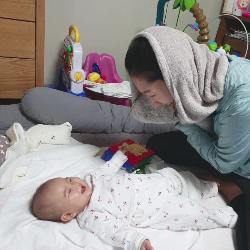수건으로 얼굴을 가렸다가 "까꿍"하고 나타나는 놀이를 좋아한다. 엄마가 눈 앞에서 안 보여도 영원히 사라지는 게 아니라 또다시 나타난다는 것을 점점 알고, 느끼는 것 같다. 깔깔깔 웃는 모습이 예뻐서 머리 감고 나와서 까꿍놀이를 무한 반복했다. 별거 아닌데 좋아하고, 웃어주는 빵이가 고맙다.