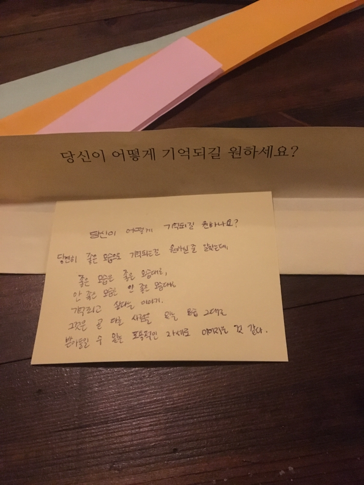 오늘 처음 만난 사람과 나이가 몇인지, 직업은 무엇인지, 결혼은 했는지, 차가 있는지 이런 개인적인 정보에 대해 묻지 않고 삶에 대한 이야기를 나누는 시간을 가져보니 신선했습니다. 겉으로 보여지는 것들로 마음속으로 사람을 평가하기 보다 삶에 대한 진솔한 대화를 나누며 서로를 알아가고, 또 서로에게 배우는 시간이었어요.
