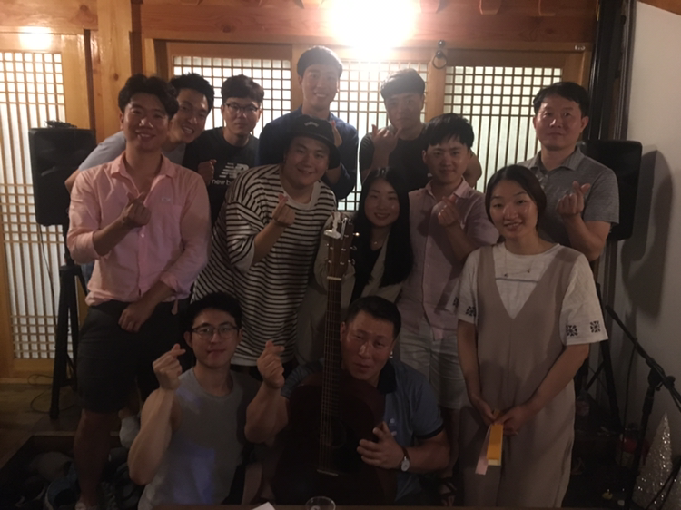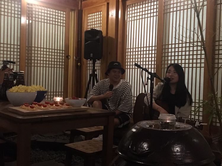 저녁을 먹는데 진행자 초롱님께서 깜짝 선물이 준비되어 있다고 하셨어요. 뭘까? 뭘까? 궁금했는데, 게스트하우스에 유재하 음악 경연대회 출신 뮤지션인 '다방'의 미니 콘서트가 기다리고 있었습니다. 하늘이 보이는 한옥 게스트하우스 아래에서 기타 선율과 함께 노래가 흘러나왔습니다. 장소와 노래가 잘 어울려서 분위기가 후끈 달아올랐어요. 처음 듣는 노래인데 따라 부르기 좋아서 모두가 흥얼흥얼 함께했습니다.