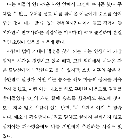 그러던 중 7년차쯤 되었을 때 검투사 이상의 아이덴티티가 필요하다는 자각을 하게 되었다. ‘사건 자체’가 아니라 ‘사람 자체’에 집중해야 한다는 점, ‘결과’ 못지않게 ‘소송과정에서의 소통과 치유’가 의뢰인에게 더 큰 위안을 준다는 점을 알게 된 것이다.