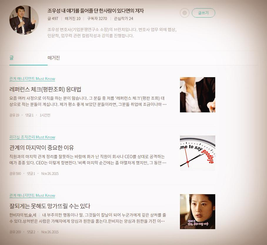 온라인에서 유독 광고성 링크에만 노출된 전문가들이 있다. 소비자들은 광고는 광고일 뿐이라는 것을 잘 안다. 다양한 칼럼을 통해 자신의 전문지식을 지속적으로 공유하는 전문가라면 신뢰를 준다.
