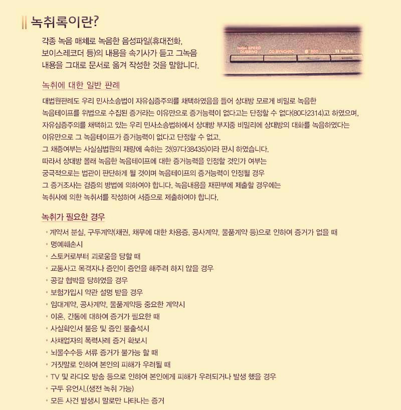 대화 내용을 상대방이 몰래 녹음한 다음 이를 증거로 쓰는 것이 과연 정당한가에 대해서 의문을 제기하는 분들이 많다. 이런 행위를 처벌하는 법규가 없으니 이 부분은 법의 사각지대에 놓여 있다. 오늘도 여기저기에서 소송을 대비한 다양한 녹음이 몰래 이뤄지고 있다.