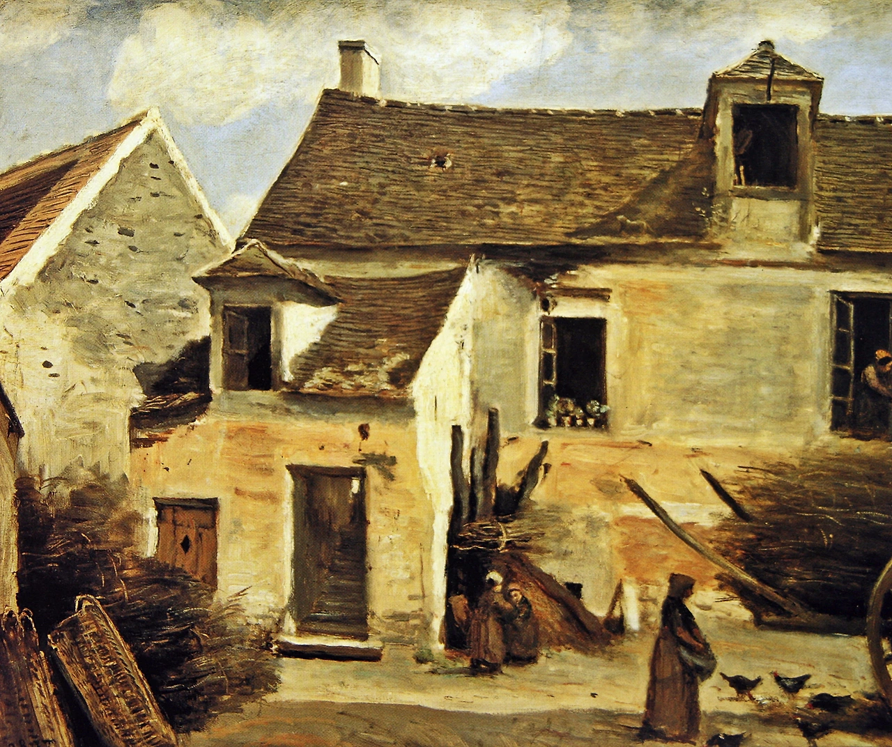 코로 역시 그런 관점에서 농촌을 보았고 그 결과 파리 근교의 농촌 풍경을 매우 사실적으로 묘사하고 있다. 화려한 궁궐과 많은 사람들, 구획된 거리와 상점들이 즐비한 도시와는 너무나 다른 풍경, 이를테면 겨울을 위한 나무더미, 모이를 주는 아낙과 닭들, 친구와 노는 아이들이 그림 속에 적절하게 배치되어 있다.