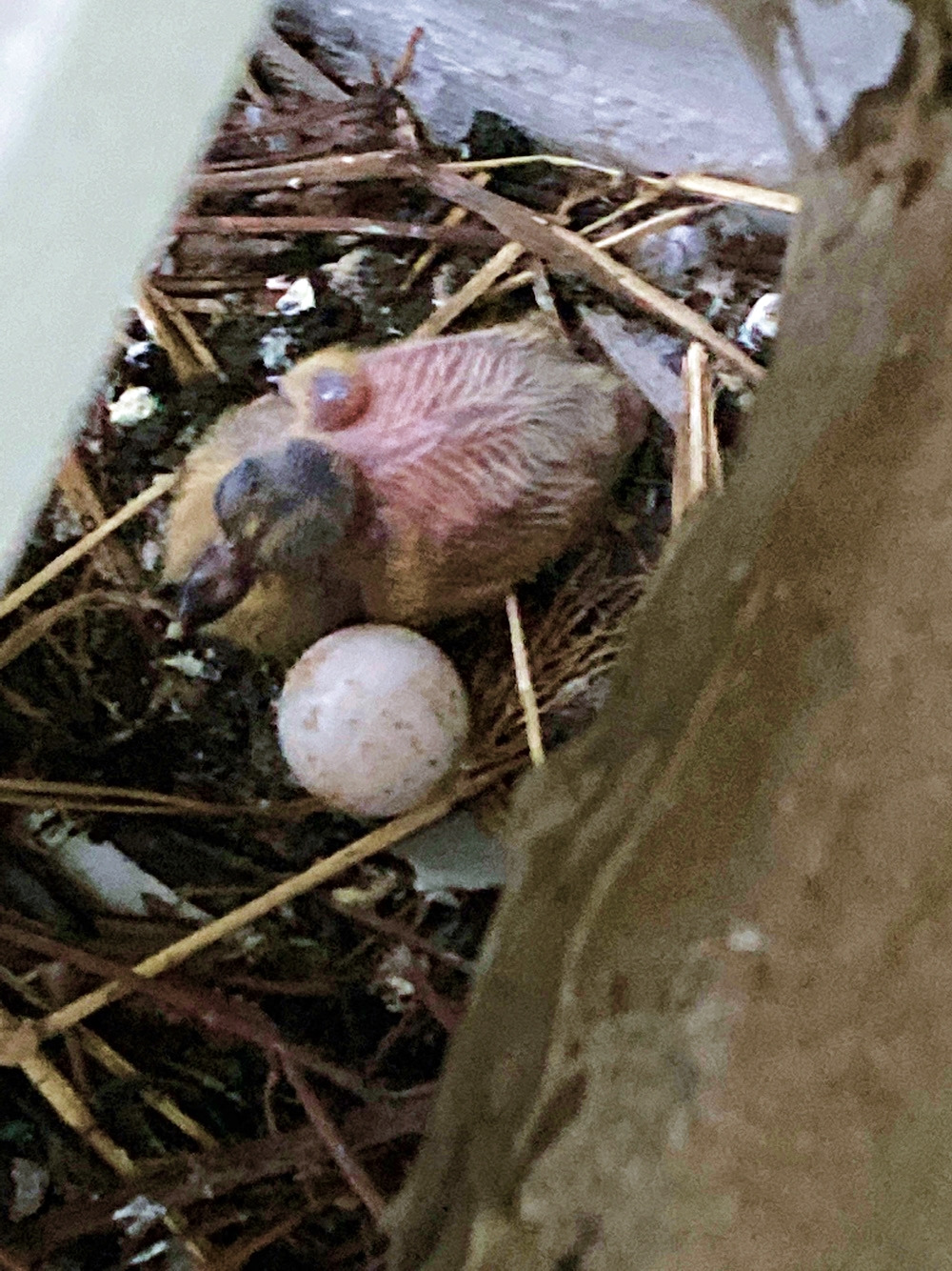 생명에 대한 예의였는지 아니면 다른 이유였는지는 몰라도 우리 집 에어컨 실외기 밑에 있는 비둘기 알의 부화를 내심 기다리고 있었다. 어제부터 안 들리던 이상한 소리가 들려 새벽에 보니 알 하나가 부화를 했다. 비둘기는 조류지만 젖이 나는 새(바위 비둘기만 그렇다.)다. 하지만 우리 집에 있는 비둘기는 보통의 산 비둘기라 어미의 먹이에 의존할 것이다. 새벽에 마침 어미는 없다.