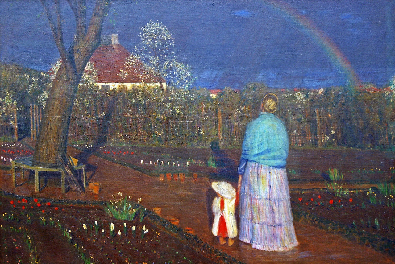 엄마와 손 잡고 서 있는 아기 주위로 이제 막 피어나는 꽃잎들과 나뭇잎들로 보아 봄이 한창이다. 우리와 기후 차이가 있어서 그런지 몰라도 독일의 봄에는 가끔 소나기처럼 거센 비가 쏟아지기도 하는데 그 덕에 멀리 무지개가 보인다. 흰색과 붉은색의 튤립이 조화를 이루고 마당의 황토색이 그림을 안정된 분위기로 만든다. 이웃집의 붉은 지붕을 배경으로 막 꽃이 피고 있는 목련과 그 밑으로 횡으로 길게 보이는 목책 울타리에는 붉은색과 흰색의 꽃들이 조화롭게 피어 있다. 마당 한편에 아주 조금 노란색 꽃이 보이지만 지금은 붉은색과 흰색이 대세다.
