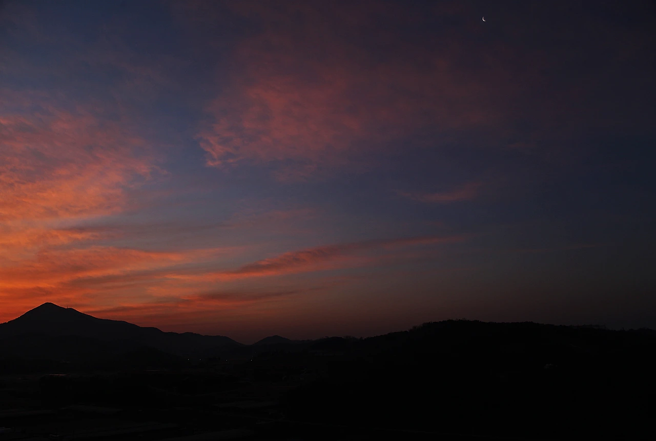 2017년 2월 21일 새벽. 새벽이 조금씩 따뜻해지는 것을 보면 봄은 이미 많이와 있는 모양이다. 해 떠오르기 전 붉고 푸르스름한 하늘은 언제나 나에게 무한한 영감을 제공한다. 하늘 가운데 떠 있는 음력 정월 25일의 하현달은 내가 사는 이곳이 광대한 우주 공간 어느 한 구석, 아주 작은 행성 지구라는 곳에 내가 살고 있음을 알게 한다.