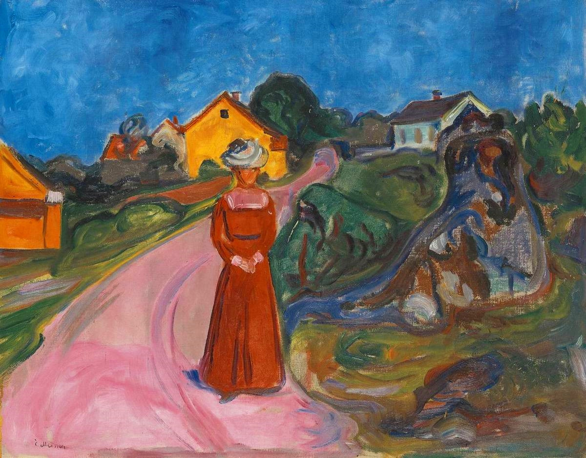 우리가 알고 있는 뭉크의 그림 ‘절규’와는 전혀 분위기가 다른 이 그림에서 붉은 옷을 입고 마을의 오솔길을 내려오는 여인의 모습은 매우 평화로우며 뒤편의 녹음과 푸른 하늘은 뭉크의 다른 그림에서는 찾아보기 어려운 풍경의 표현이다. 어쩌면 뭉크의 모든 시기의 그림과 비교해 보아도 가장 밝고 화사하며 안정감 있는 그림에 속할지도 모른다.