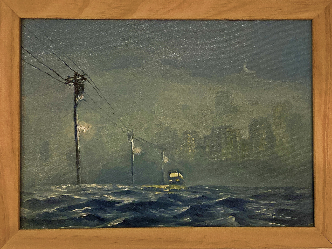 빌딩 숲이 안개 같은 불투명에 가려져있다. 그리고 그 뒤로 어두운 하늘과 엄경근의 달이 떠 있다. 결정적인 것은 뒤뚱거리는 버스와 억지로 빛을 내는 부스스한 가로등, 그리고 길조차 가려버리는 파도가 있는 풍경이다. 파도에 가려 길이 보이지 않는 것은 화가의 시선이 매우 낮다고 생각할 수 있는데 의외로 버스는 매우 온전히 그려진 것으로 미루어 화가는 이미 논리적 기준을 버리기로 마음먹었다.