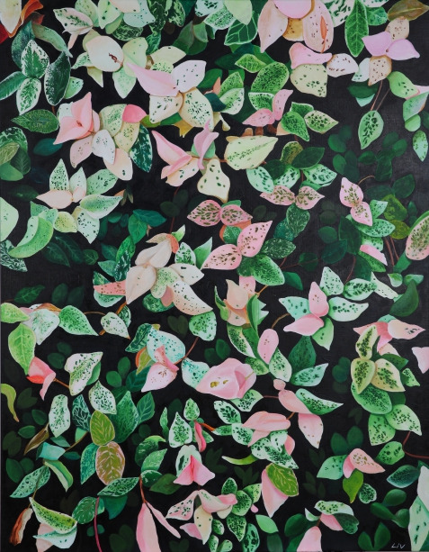 마치 사각뿔의 꼭짓점 중앙에서 빛이 비치듯 아래로부터 위로 향할수록 대상이 점점 밝아진다. 동시에 밑으로 내려 갈수록 빛은 어두워지고 마침내 검은색으로 통일된다. 이런 광원의 설정은 자연스럽게 채색이 동일해질 수 있는 위험성이 매우 크지만 채색의 동일성을 벗어나려는 작가의 노력은 눈물겹다. 거칠지만 분명하게 존재하는 리듬이 겨우 작가를 지탱하게 하지만 워낙 실물의 형태와 색채는 견고하다. 화면 밑으로 틀림없이 흐르고 있을 마삭줄의 변화(작가 내면의 풍경)가 작품의 관람자에게 읽히기는 어렵다. 다만 작가의 끈질긴 노력, 이를테면 각각의 잎이 가리키는 방향과 미세한 뒤틀림, 조도의 차이 채색의 강도로, 관람자에게 반복에서 오는 질서를, 그리고 미약하지만 리듬에서 오는 변화를 느낄 수 있게 한다.