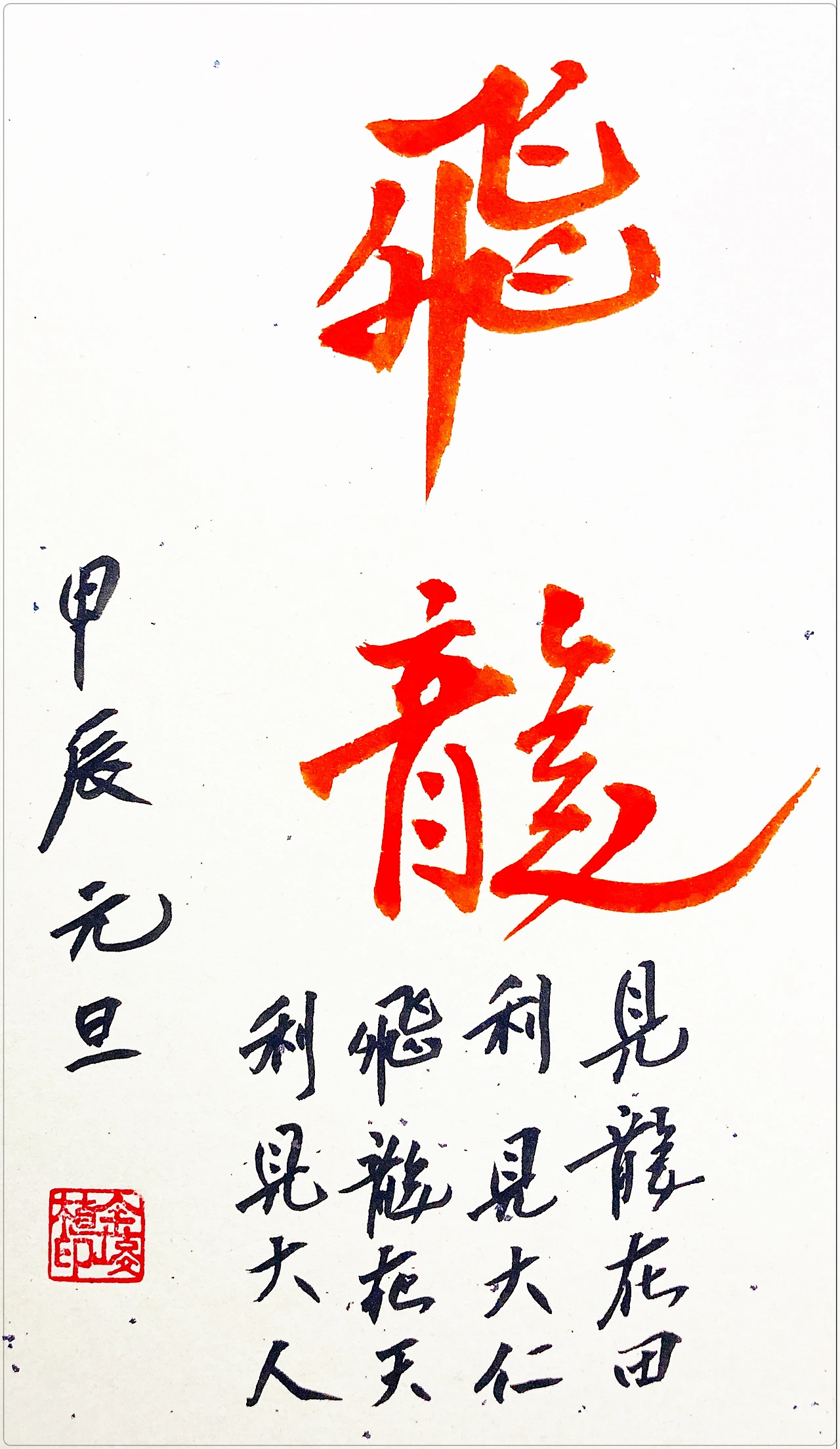 주역 건괘에 용 이야기가 있다!! 한 글자를 바꿨다. 2024년엔 날아 오르는 용을 보자!! 주토로 썼는데 사진을 찍으니 너무 붉다!! 어쨌거나 … 모두 위대해지는 2024년이기를 …