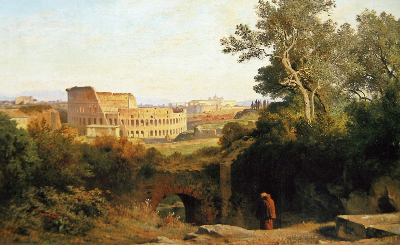 현재의 콜로세움은 주위는 깨끗하게 단장되어 관광객들이 포로 로마노의 폐허와 함께 로마를 느끼는 관광 명소가 되었지만 이 그림이 그려질 1870년 당시의 콜로세움은 그림에서 처럼 낮은 언덕과 함께 고대 로마의 신비를 아직은 많이 유지하고 있는 것처럼 보인다. 폐허의 성벽으로 난 작은 관문을 통해 어디론가 가고 있는 사람의 옷차림으로 보아 기독교의 수사 모습인데 흰 머리카락만 보이는 것이 왠지 쓸쓸한 느낌을 준다.