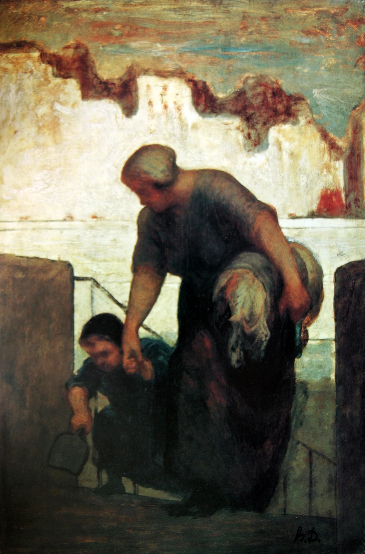 하지만 뒤쪽 배경은 환하다. 아마도 아침나절 해 떠오르는 무렵 막 일터에 도착한 세탁부 모녀를 묘사한 듯하다. 어머니는 손을 마주 잡은 딸아이가 계단을 오르는 것을 유심히 살피고 있다. 도미에 그림에서 언제나 느낄 수 있는 따뜻한 인간미가 예외 없이 이 장면에서 느껴진다. 아이가 계단을 잘 오르지 못해도 어머니는 전혀 채근하지 않는다. 약간 구부린 그녀의 자세와 느슨하게 잡은 그녀의 손으로 보아 아이가 제 힘으로 계단을 오를 수 있도록 충분히 시간을 주고 있는 모습이다.