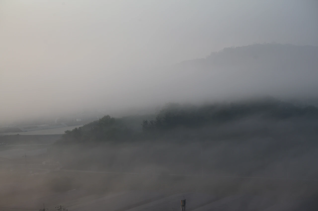 2017년 4월 26일 아침, 안개 자욱한 세상을 보다. 복잡한 세상의 모습이 지금 이 순간은 저 안개 밑에서 고요하다. 안개 낀 짧은 순간, 그 안개로 세상의 불편함과 부조리가 깨끗해져서, 해 떠올라 밝아지고 안개 걷히면 달라진 세상이 되기를 간절히 빌어본다. 허망한 꿈이다.