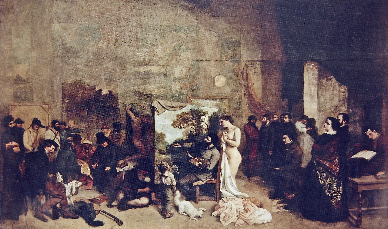 1854~5년 사이에 그린 이 그림의 제목은 L'Atelier du peintre(화가의 아틀리에)인데 그 부제가 더 길고 의미심장하다. 부제는 Allégorie Réelle déterminant une phase de sept années de ma vieartistique (et morale)인데 풀이해 보자면 “7년 동안 나 자신의 예술적 삶, 또는 도덕적 국면에 대한 실질적 은유(이중성)”로 풀이될 수 있다. 즉 이 그림은 그가 왕성한 활동을 한 7년 동안 자신에게 일어났던 예술적이고 도덕적인 자극과, 그 자극에 대한 반응과 감상을 한 화면에 중첩적으로 묘사함으로써 마치 하나의 연대기처럼 보이는 그림이다.