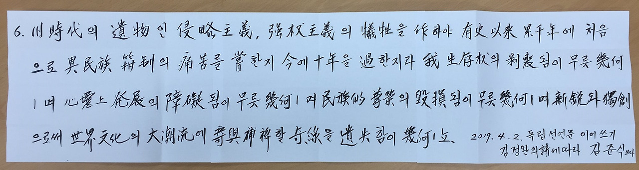 몇 년 전 이 시기에 3.1 독립선언서 중 일부를 필사로 써서 페이스 북에 올리는 일이 잠시 유행한 적이 있다. 그때 나는 이렇게 글을 썼다.