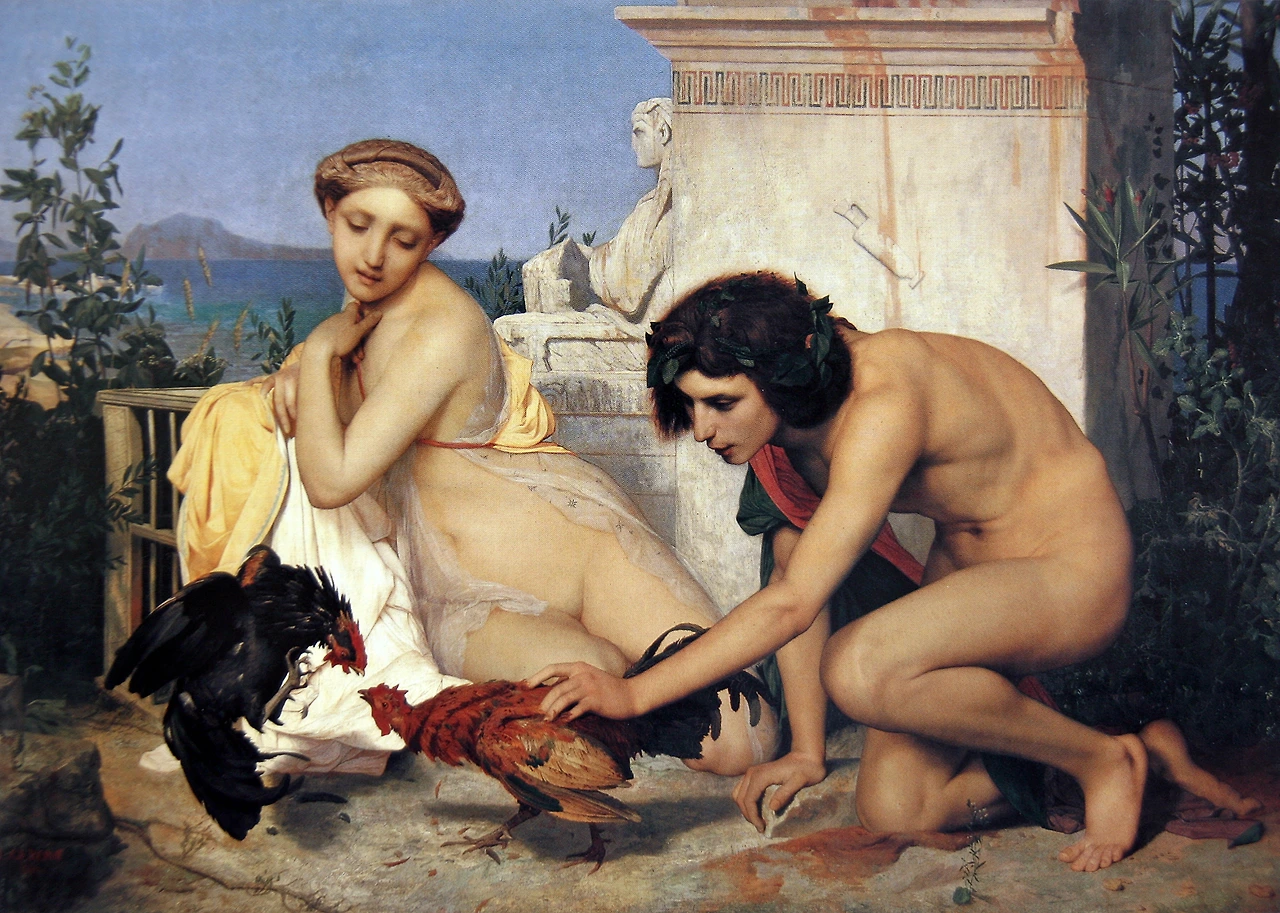 제목에 표시된 것처럼 그림의 주인공은 젊은 그리스 남녀이다. 인물을 누드로 그린 것은 “아카데미즘”이 추구하는 원칙에 가깝다. 즉 “아카데미즘”이란 르네상스적 규범에 충실한 고전주의적 경향을 말하는데 이때의 인물 표현은 제작적 비례를 따라 그리는 것이다. 사람의 피부를 완벽하게 재현한 붓 터치와 옷의 질감을 표현하는 방법은 이전 로코코의 전통도 얼핏 느껴지는데 이것 역시 아카데미적인 경향의 핵심이라고 볼 수 있다. 뿐만 아니라 닭의 깃털 하나하나를 매우 정교하게 표현하여 “드로잉이 보이는 것은 회화라고 볼 수 없다”라는 Jean-Auguste-Dominique Ingres(앵그르)의 정신과도 부합한다.