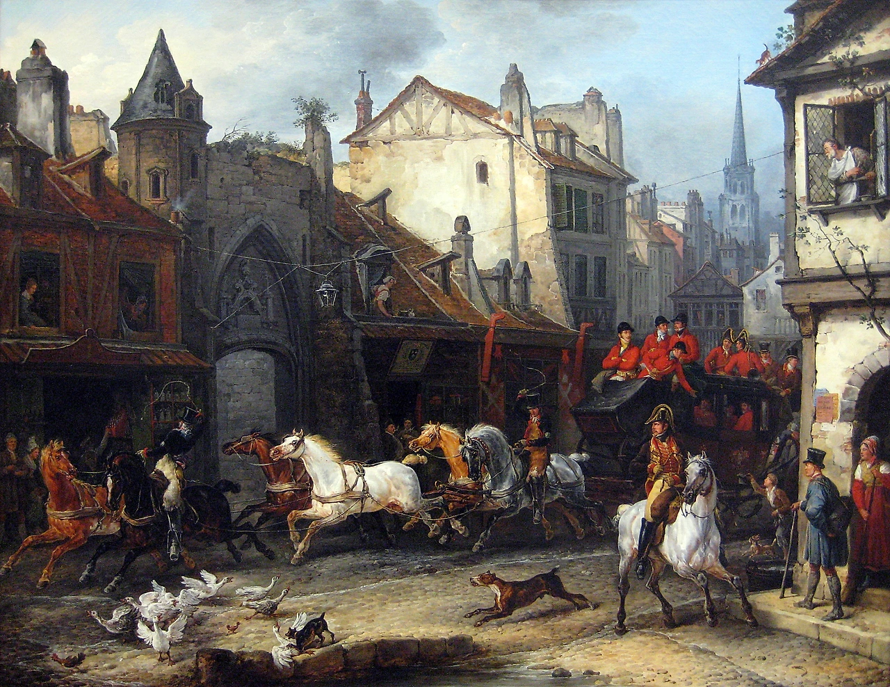 동네 가운데 평화롭게 놀던 거위 떼는 혼비백산하고 개는 이리저리 뛰고 있는 가운데 이층에 있던 아낙은 이 광경을 보기 위해 밖으로 몸을 내밀고 있다. 마차 옆에는 걸인이 모자를 들고 구걸을 하고 지나가던 행인은 멀찌감치 피해 행렬이 지나가는 것을 바라보고 있다. 나폴레옹 1세가 연합군에 의해 퇴위되고 나폴레옹의 하나뿐인 아들(나폴레옹 2세)은 멀리 오스트리아에서 있던 혼란의 시기, 혁명의 짙은 그늘은 민중의 삶을 도탄에 빠트렸지만 여전히 권력의 주변부에 있던 누구는 사냥을 하고 어떤 마을을 스쳐 지나가고 있는 중이다. 혁명의 결과로 등장했던 나폴레옹의 몰락은 프랑스의 근간을 흔들었고 이어지는 잦은 혁명의 터를 제공하기도 했다.