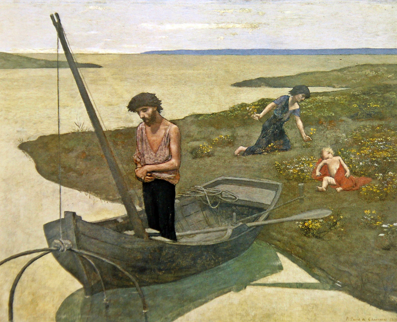 어부가 배 위에서 기도를 올리고 있다. 어부의 행색으로 보아 최근에 고기를 잡아 돈을 만든 적이 없는 듯, 초췌하고 남루해 보인다. 그의 아내와 아이는 꽃이 핀 풀밭에 있는데 아내는 꽃을 꺾어 한 다발을 쥐고 있고 아이는 그 꽃 밭에 누워있다. 이 무표정해 보이는 가족들이 오히려 어부의 표정과 함께 더 쓸쓸해 보인다. (혹자는 두 아들이라고 해석하기도 하는데 그러기에는 나이차가 너무 많아 보인다. 하지만 둘의 관계가 아무려면 어떠리 ) 이 그림은 샤반 이전의 화가들에게서 찾아보기 어려운 채도와 명도가 낮은 약간은 무거운 색을 주조로 했는데 이는 그가 벽화를 주로 그렸기 때문이었을 것이다.