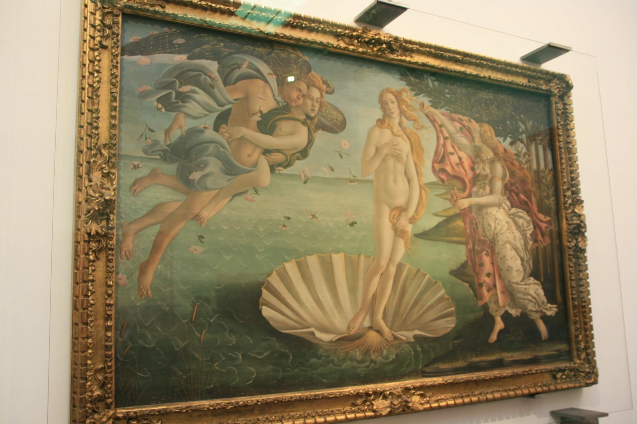 참 어처구니없지만 이 모든 것은 상징으로 이해하면 뭐 그리 어이없는 일도 아니다. 한 참을 바다에서 자란 여신은 이제 막 마른땅에 막 발을 내딛으려고 한다. 왼쪽에는 제피 루스와 아내 클로리스가 비너스를 해안 쪽으로 가도록 바람을 불어내고 있다.